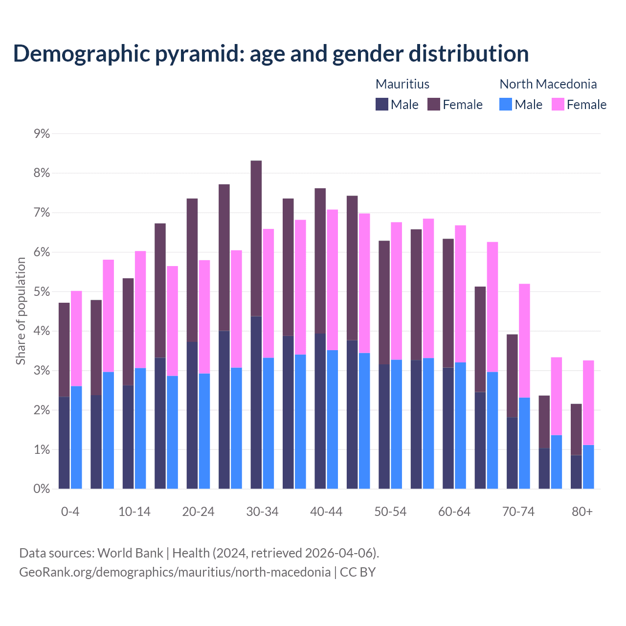 - Mauritius is ranked 57/196 by median age (oldest to youngest) vs 37/196 for North Macedonia.