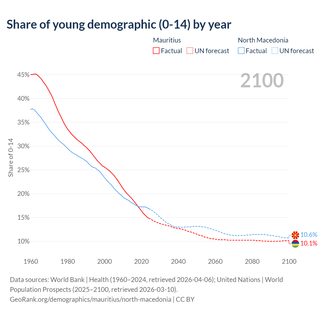 - The share of young demographic (0-15 years old) in Mauritius is 14.8% vs 16.8% in North Macedonia.