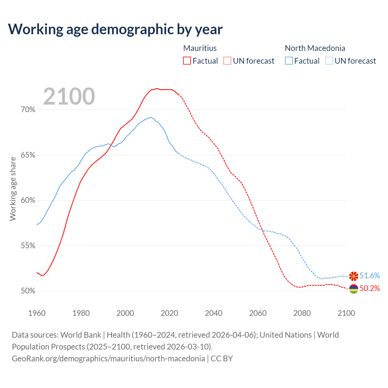 - Mauritius has 889K working age adults (aged 15-64) vs 1.18M in North Macedonia.