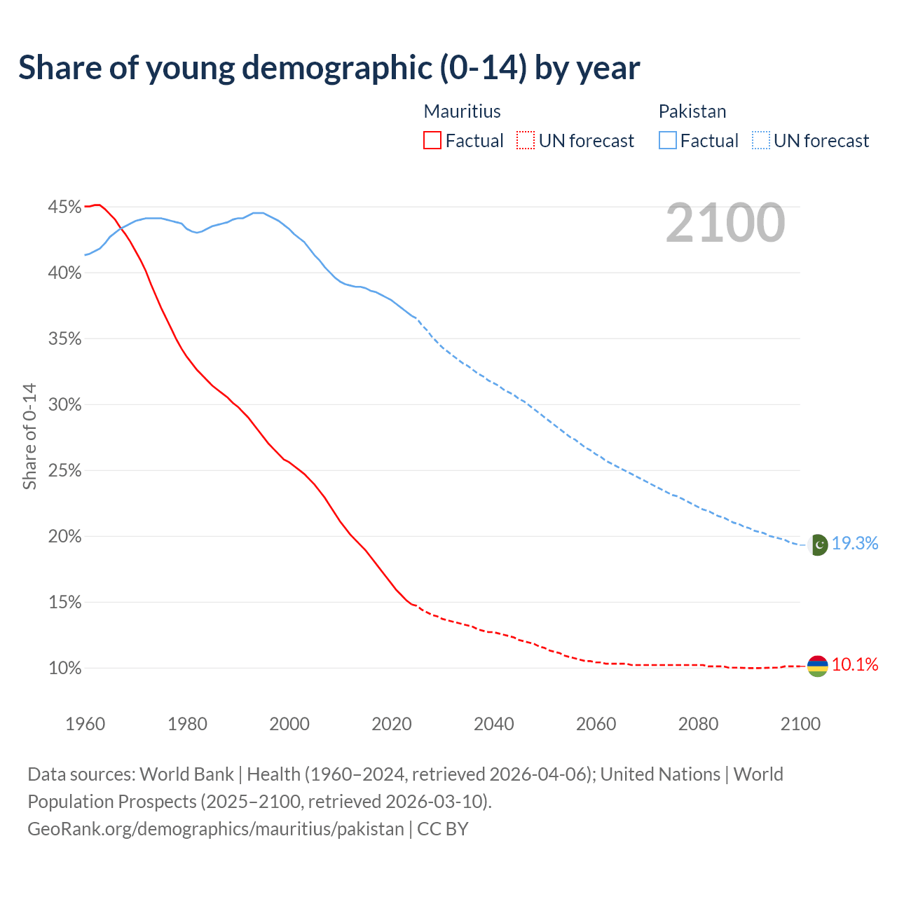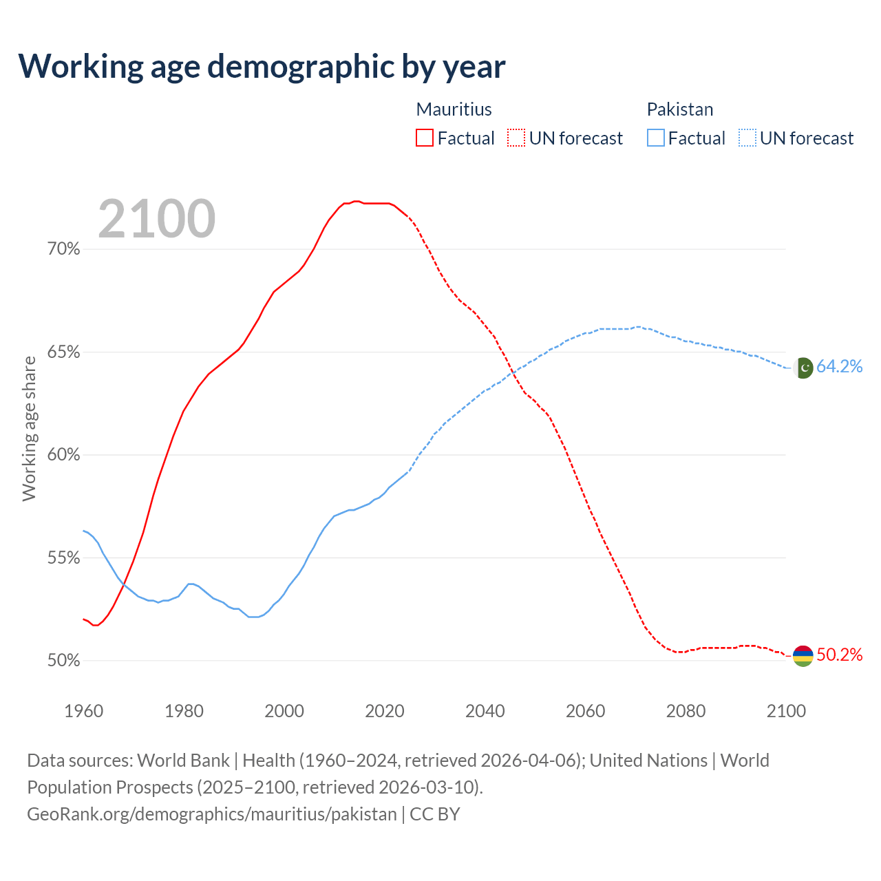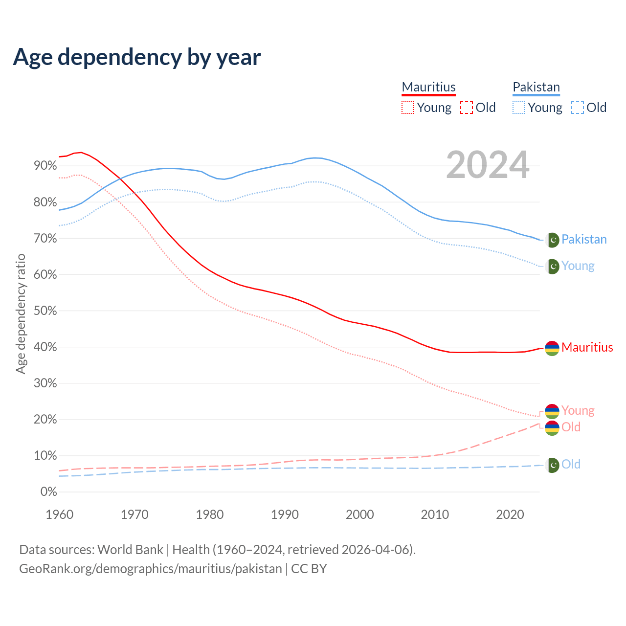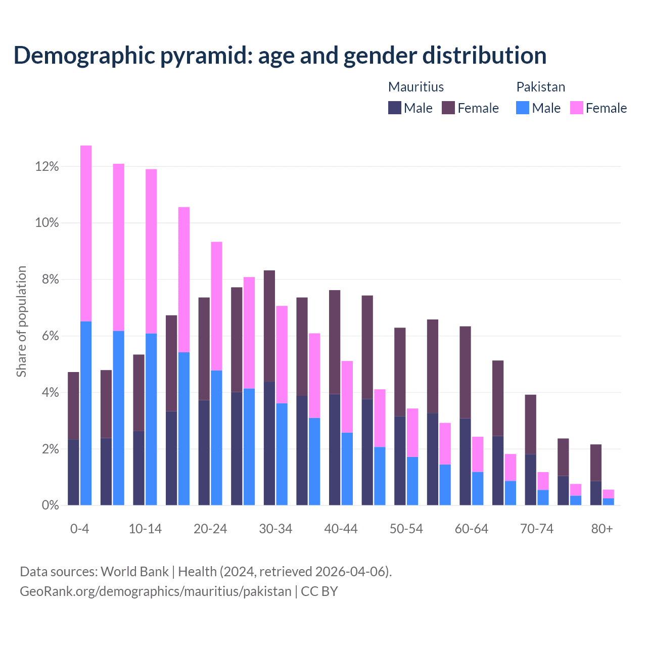 - Mauritius is ranked 57/196 by median age (oldest to youngest) vs 154/196 for Pakistan.