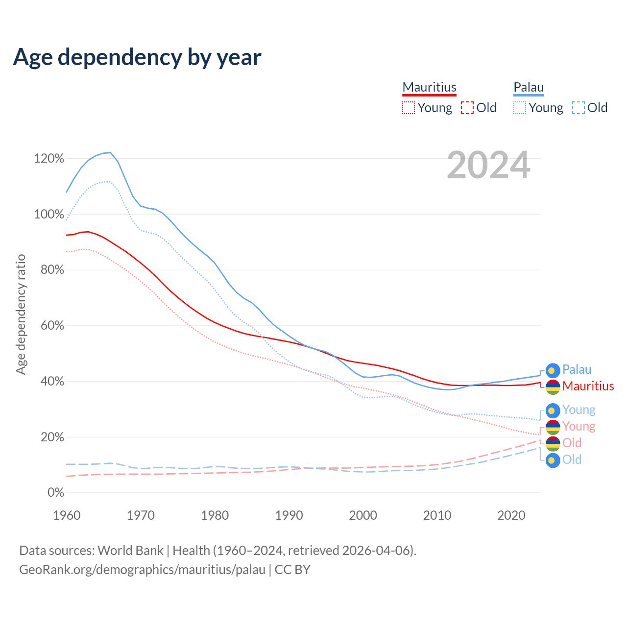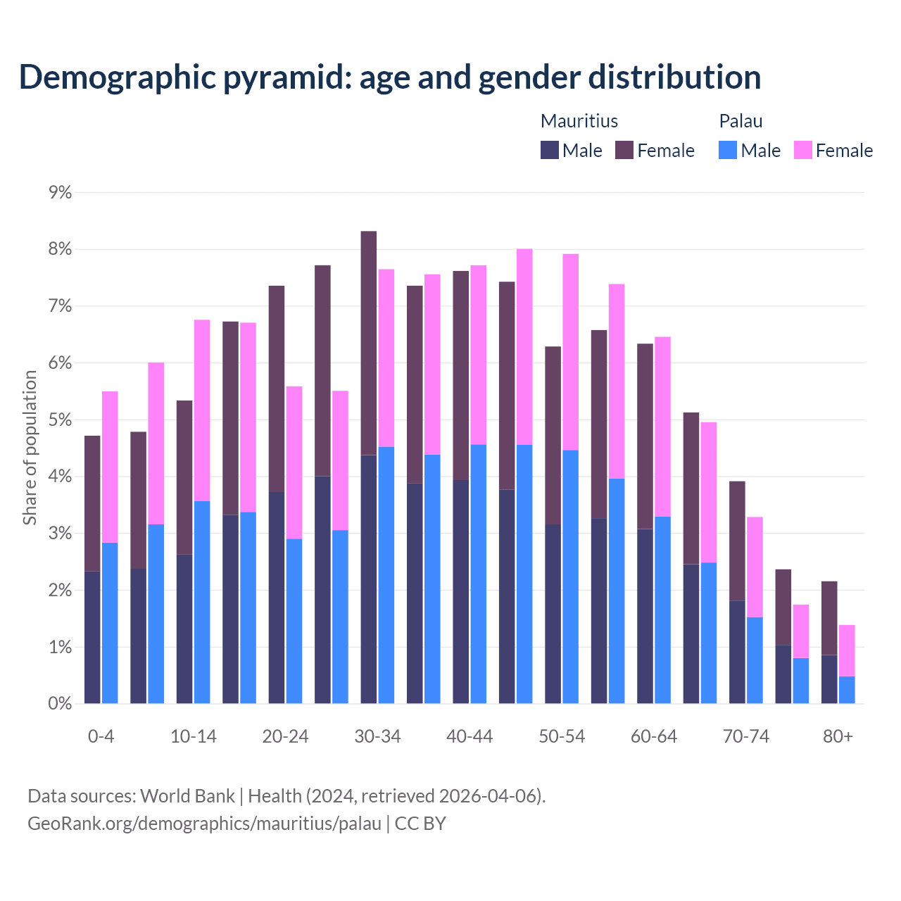 - Mauritius is ranked 57/196 by median age (oldest to youngest) vs 53/196 for Palau.