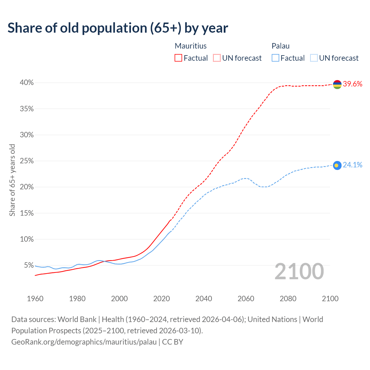 - The share of old-age demographic (65+) in Mauritius is 13.5% vs 11.3% in Palau.