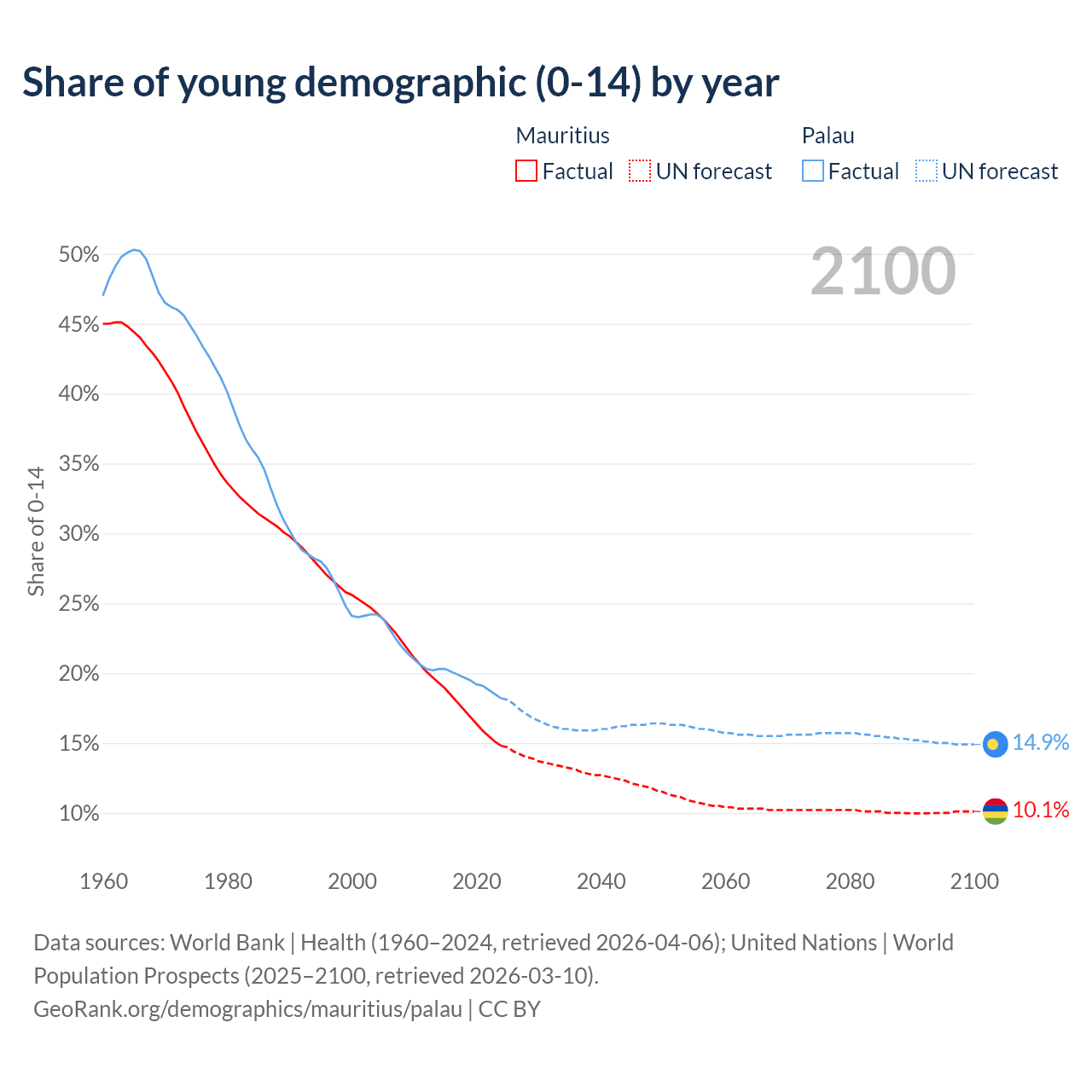 - The share of young demographic (0-15 years old) in Mauritius is 14.8% vs 18.2% in Palau.
