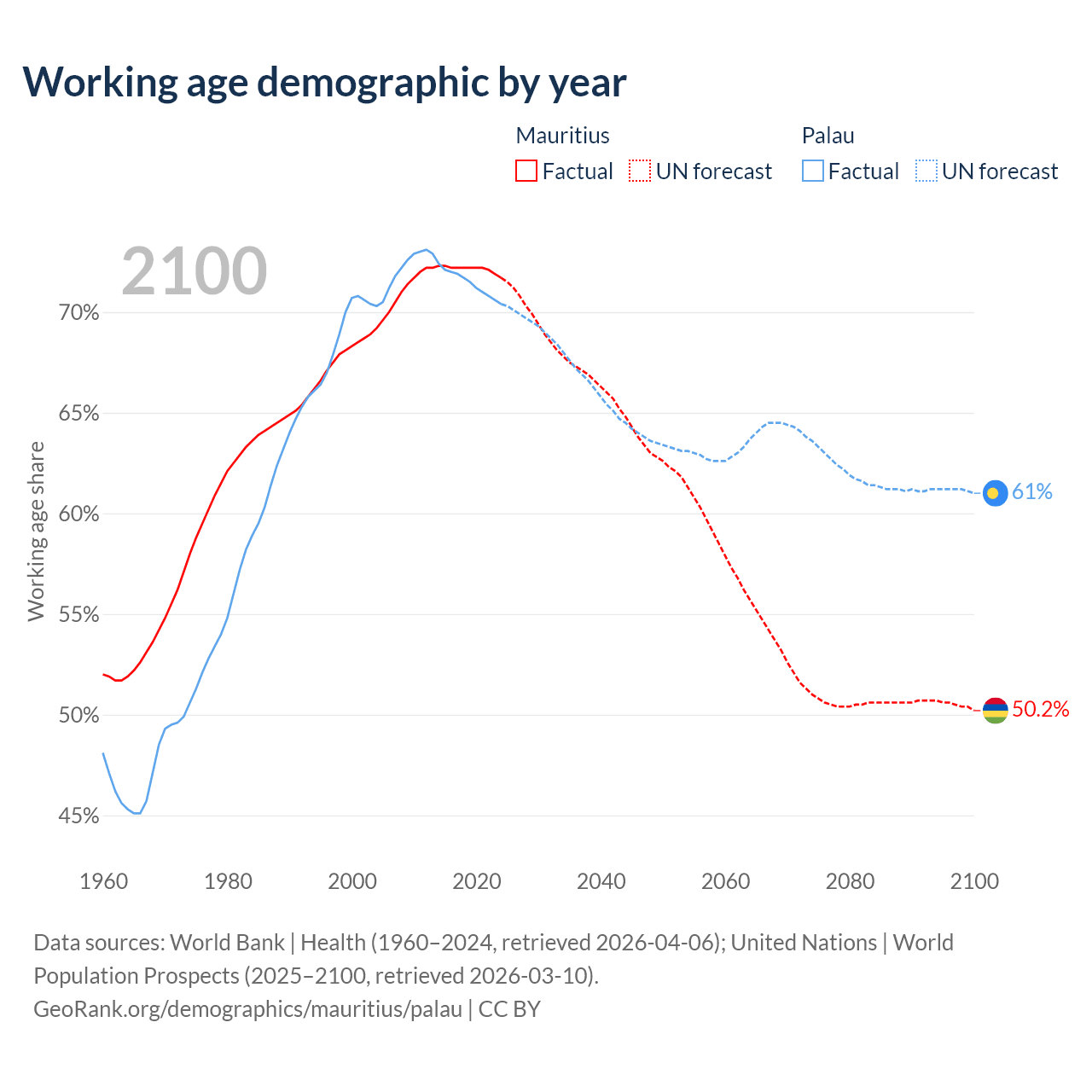 - Mauritius has 889K working age adults (aged 15-64) vs 12.4K in Palau.