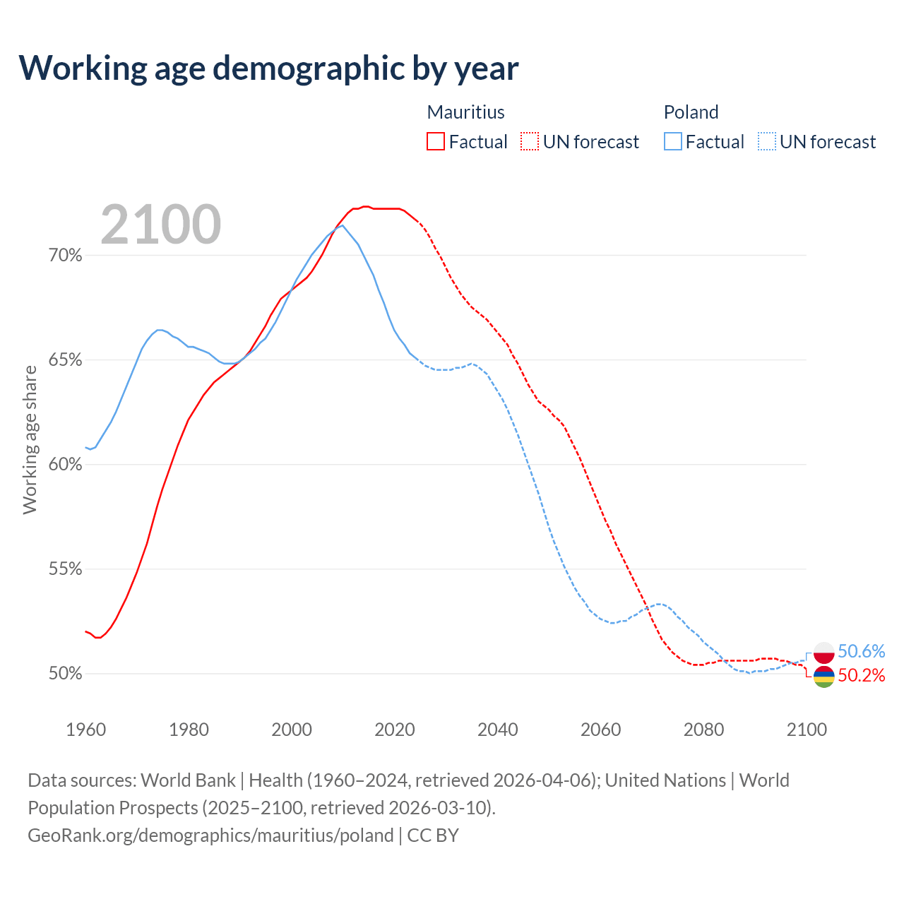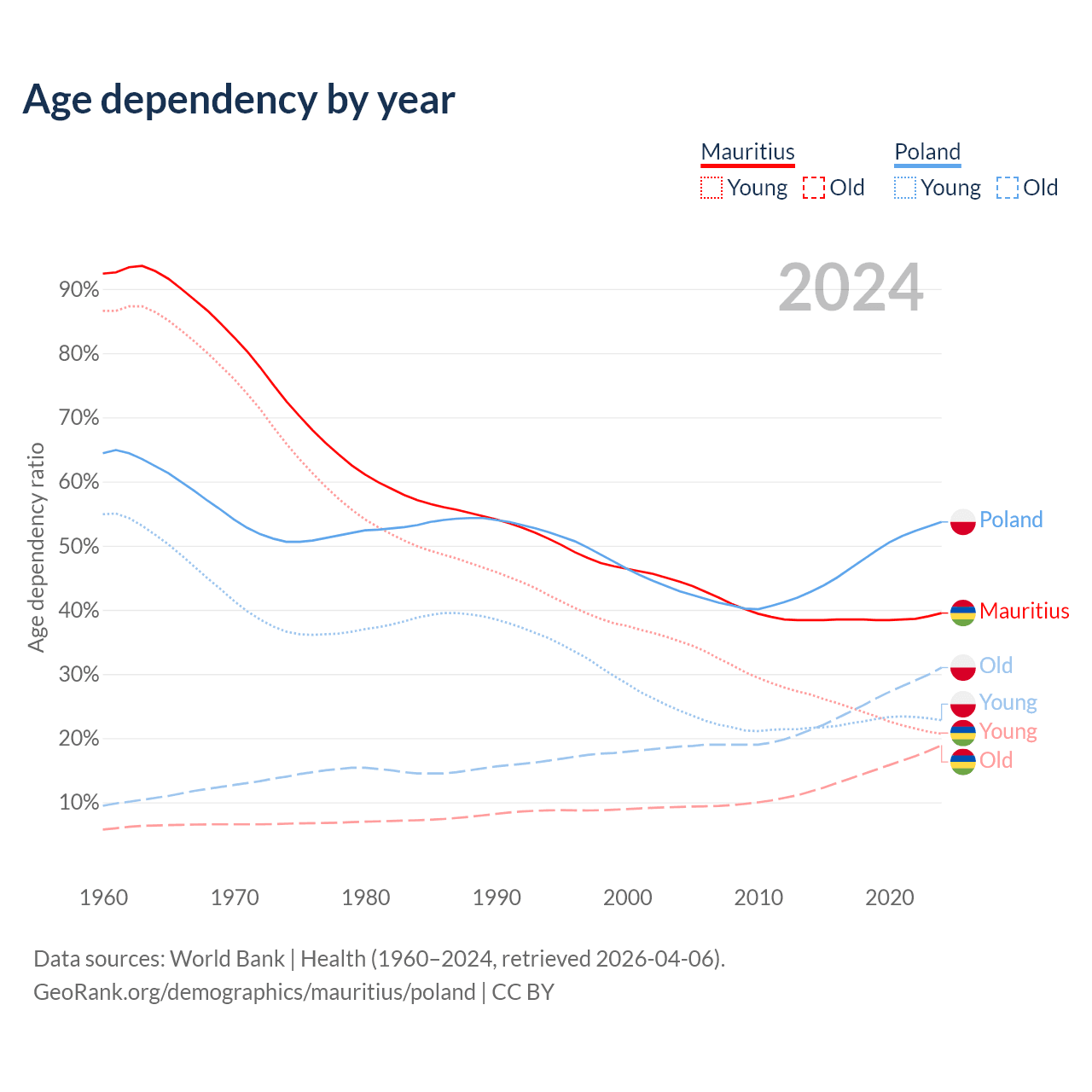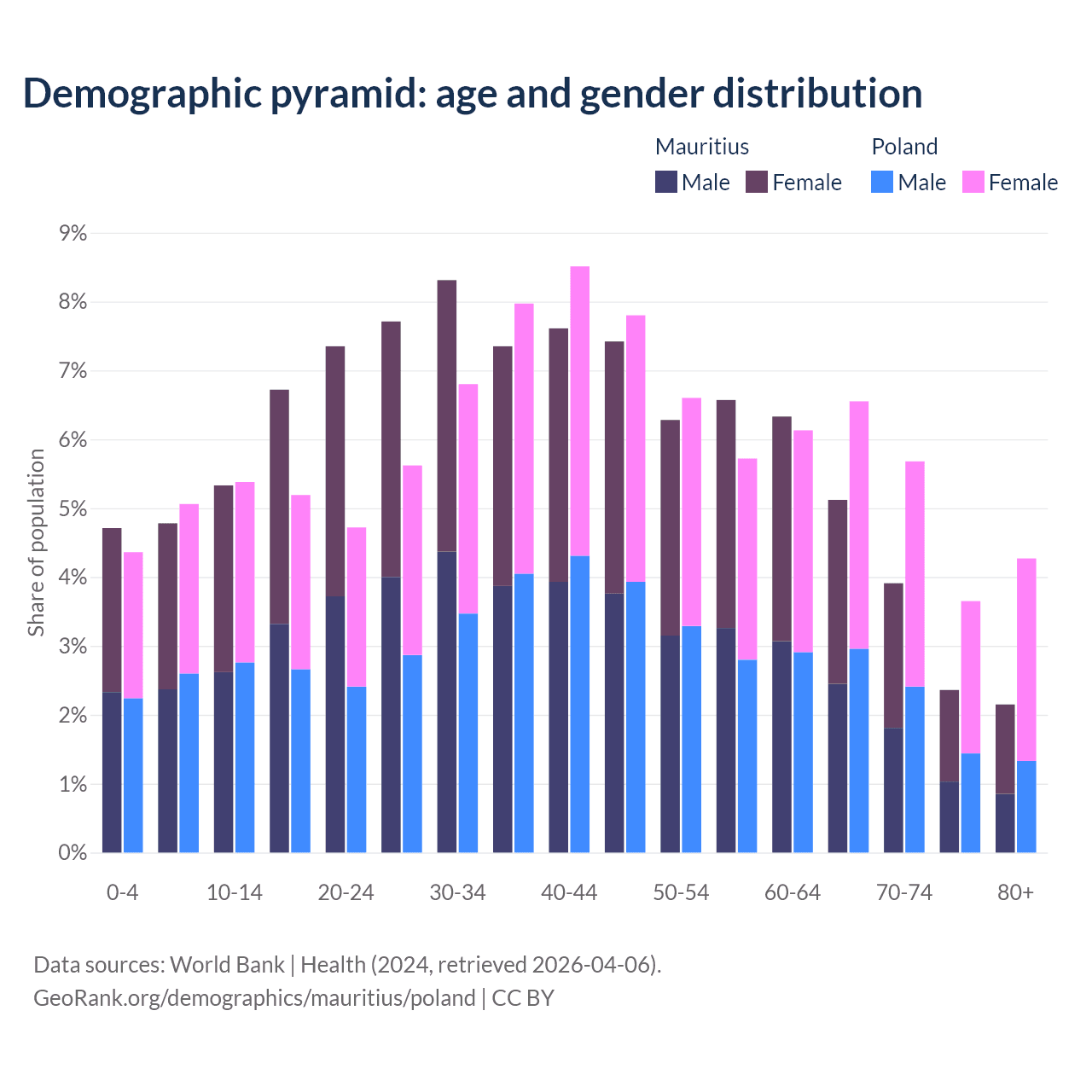 The share of older people aged 65 and over is 13.5% in Mauritius and 20.1% in Poland. Life expectancy in Mauritius compared to Poland .