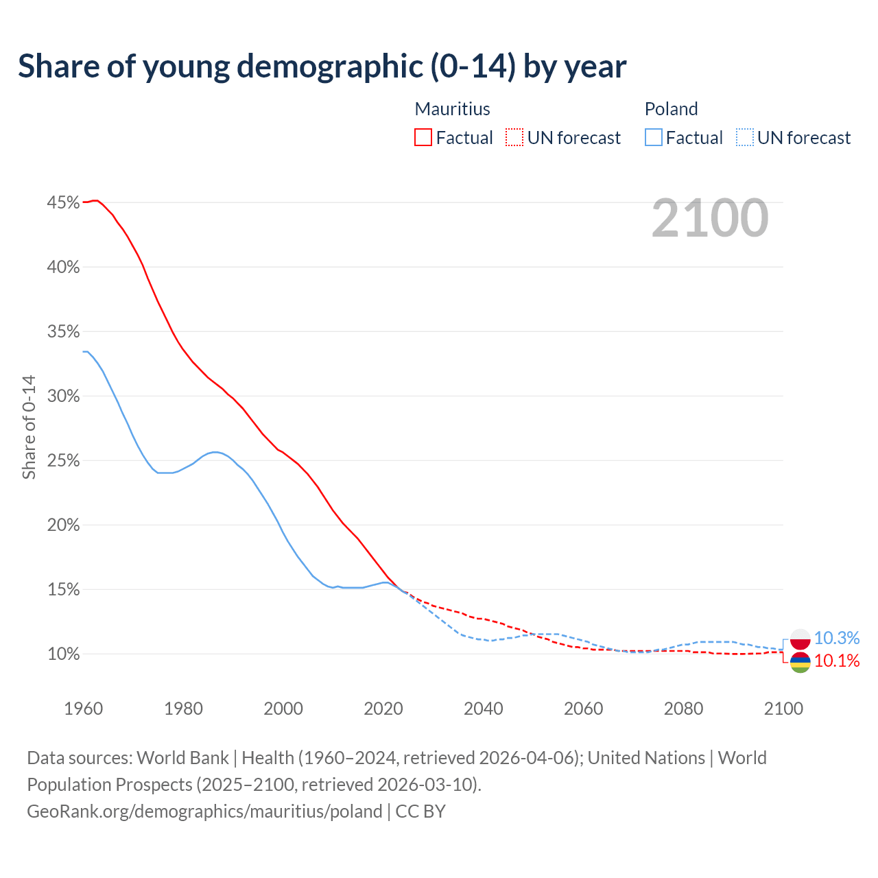 - The share of young demographic (0-15 years old) in Mauritius is 14.8% vs 14.8% in Poland.