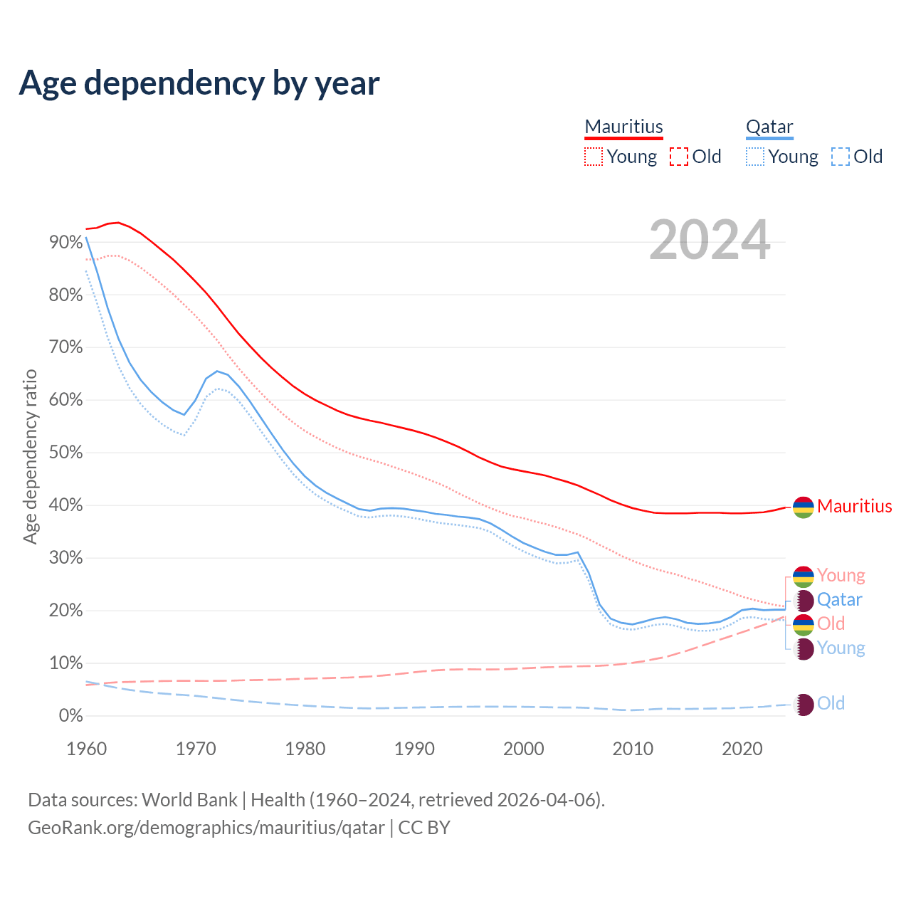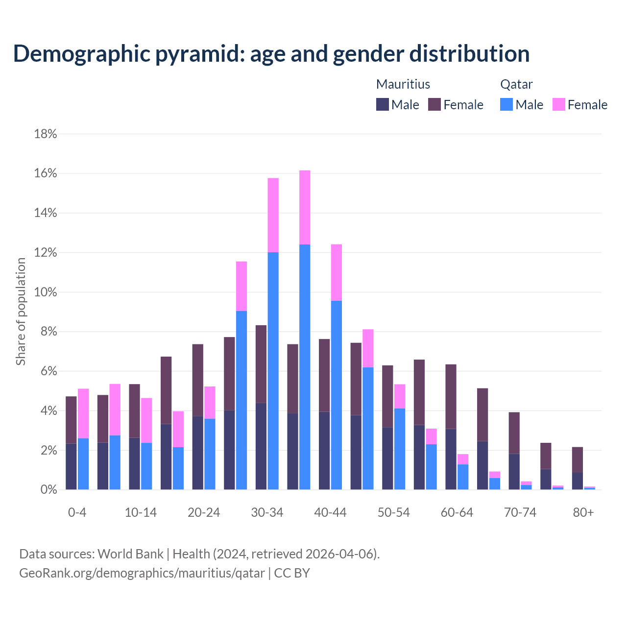 - Mauritius is ranked 57/196 by median age (oldest to youngest) vs 78/196 for Qatar.