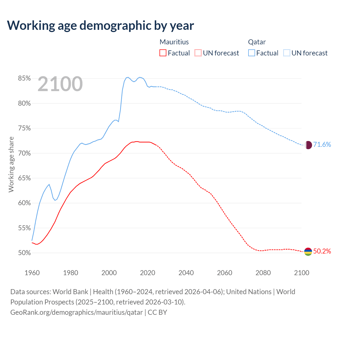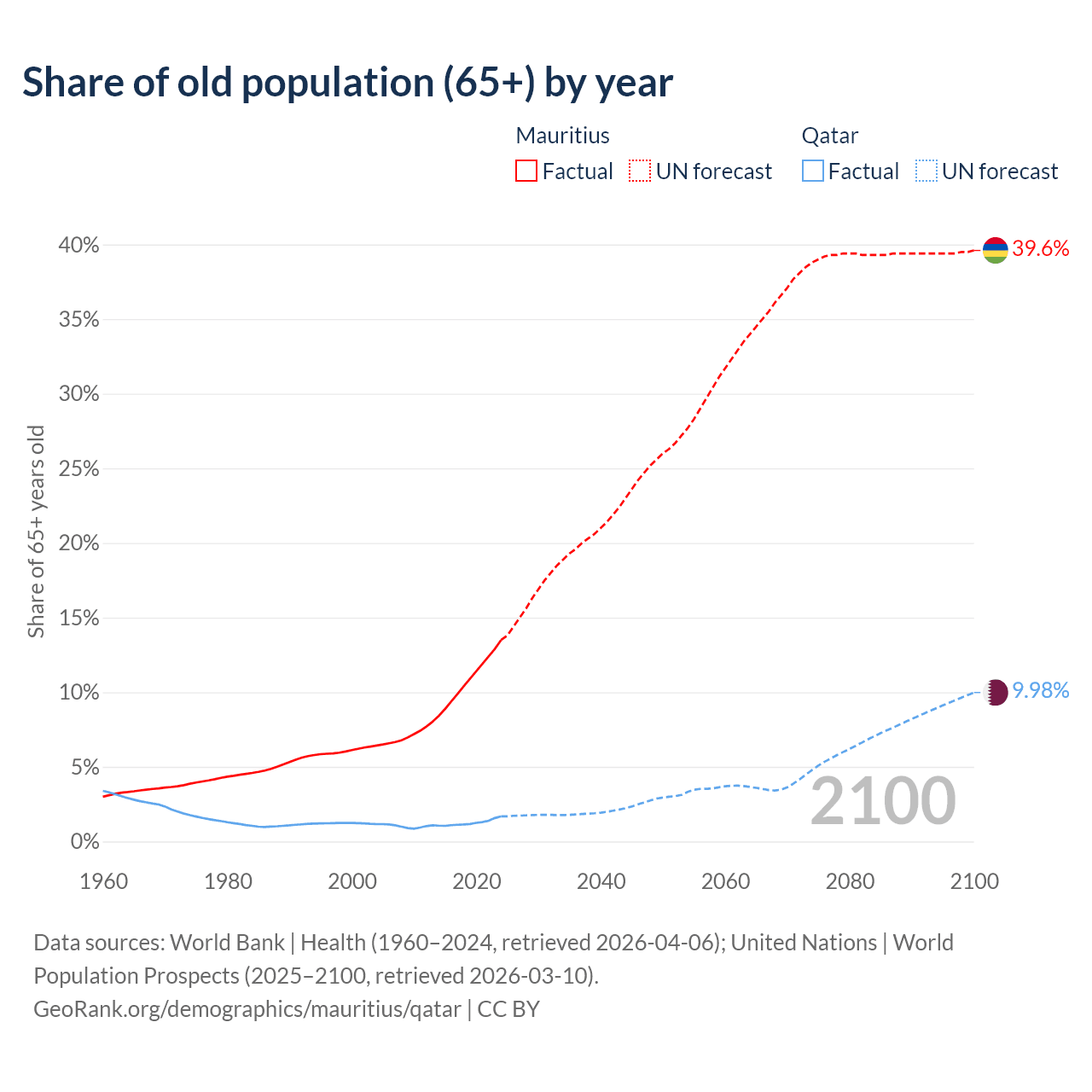 Median age Mauritius vs Qatar, 1960-2100