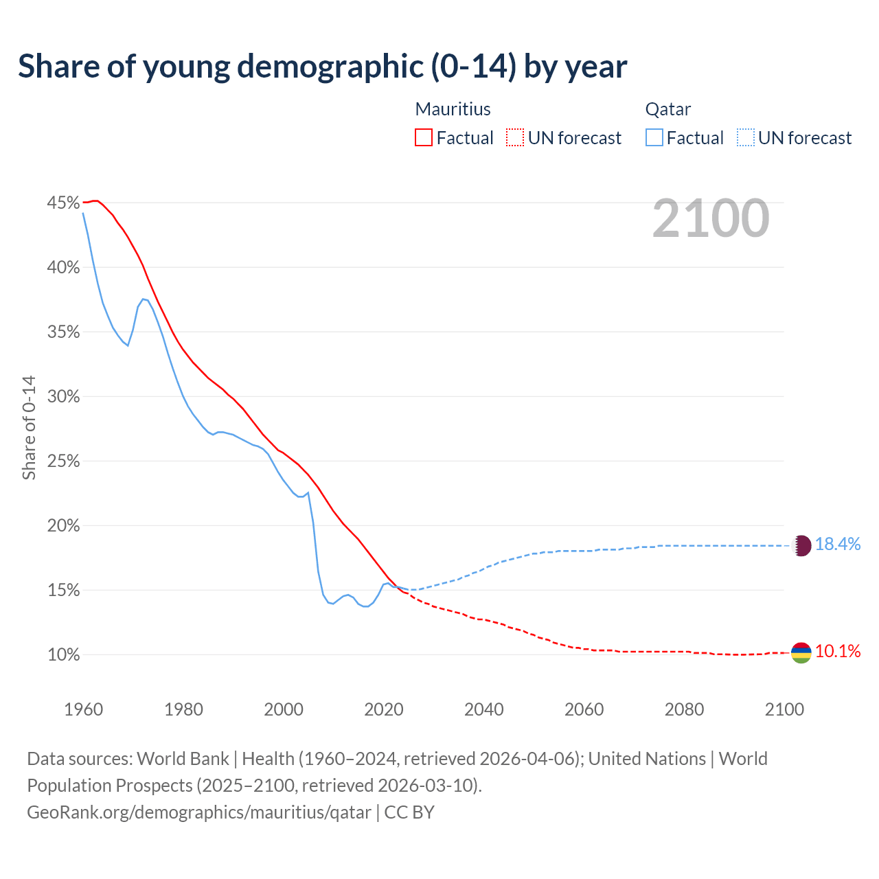 - The share of young demographic (0-15 years old) in Mauritius is 14.8% vs 15.1% in Qatar.