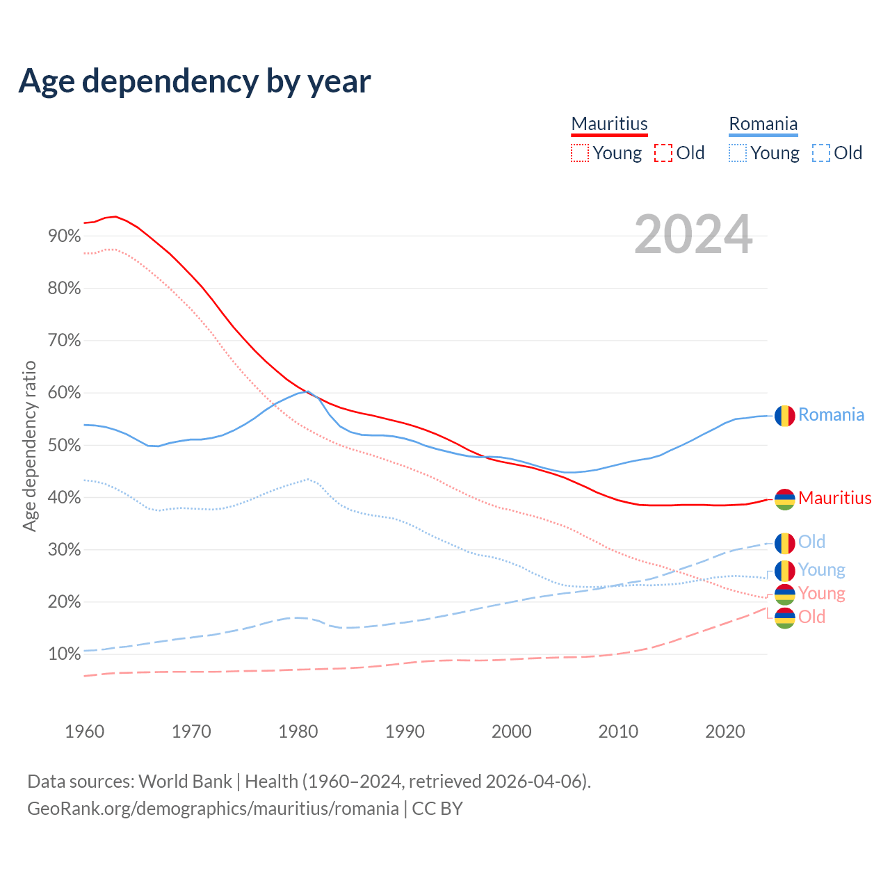 - Mauritius is ranked 57/196 by median age (oldest to youngest) vs 23/196 for Romania.