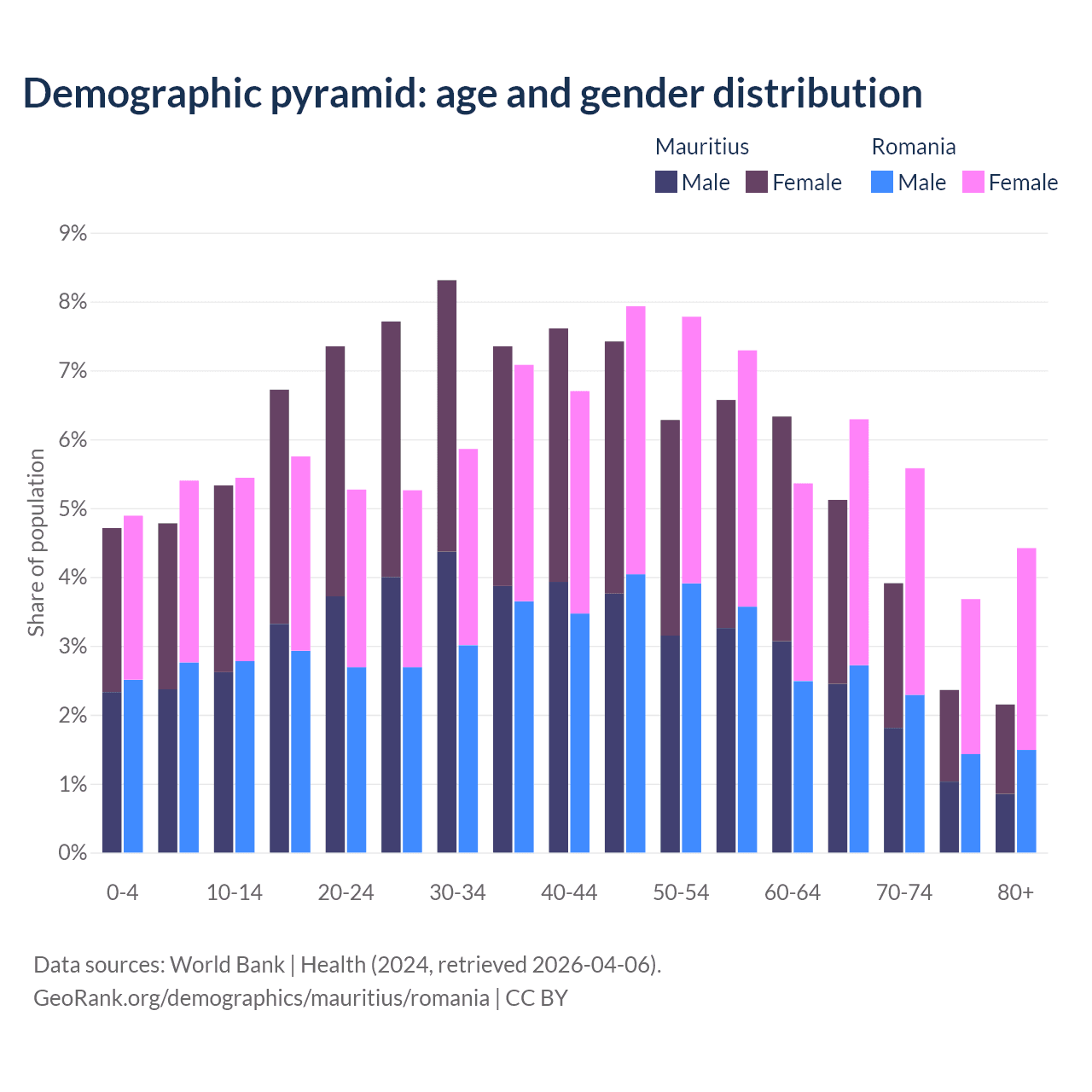 The share of older people aged 65 and over is 13.5% in Mauritius and 20% in Romania. Life expectancy in Mauritius compared to Romania .