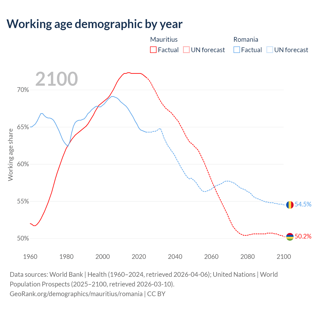 Median age Mauritius vs Romania, 1960-2100