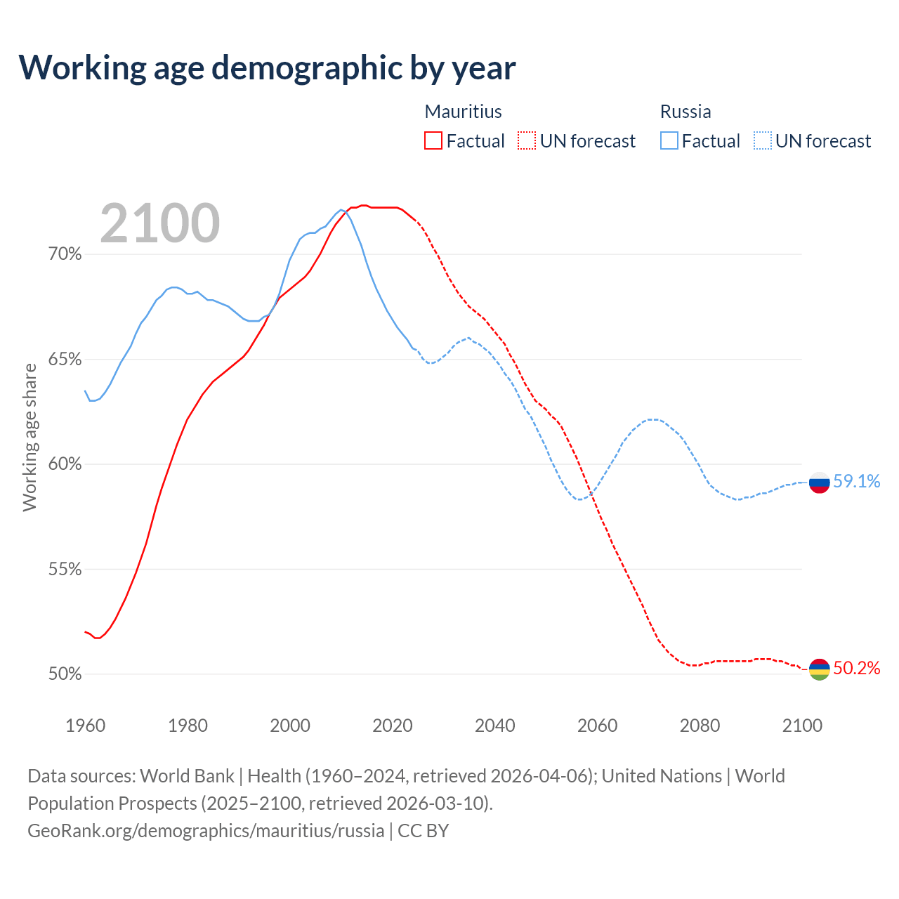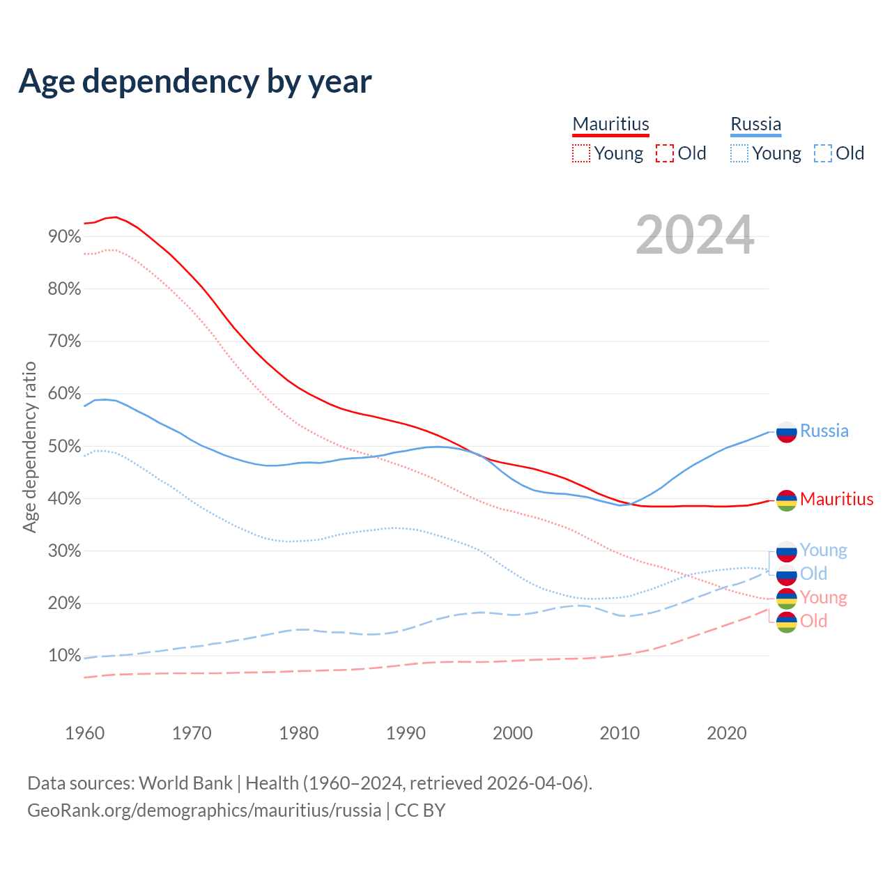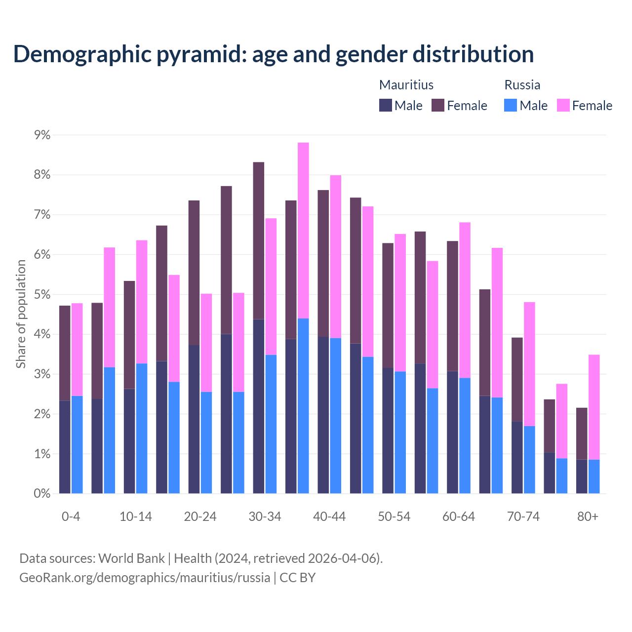 - Mauritius is ranked 57/196 by median age (oldest to youngest) vs 42/196 for Russia.