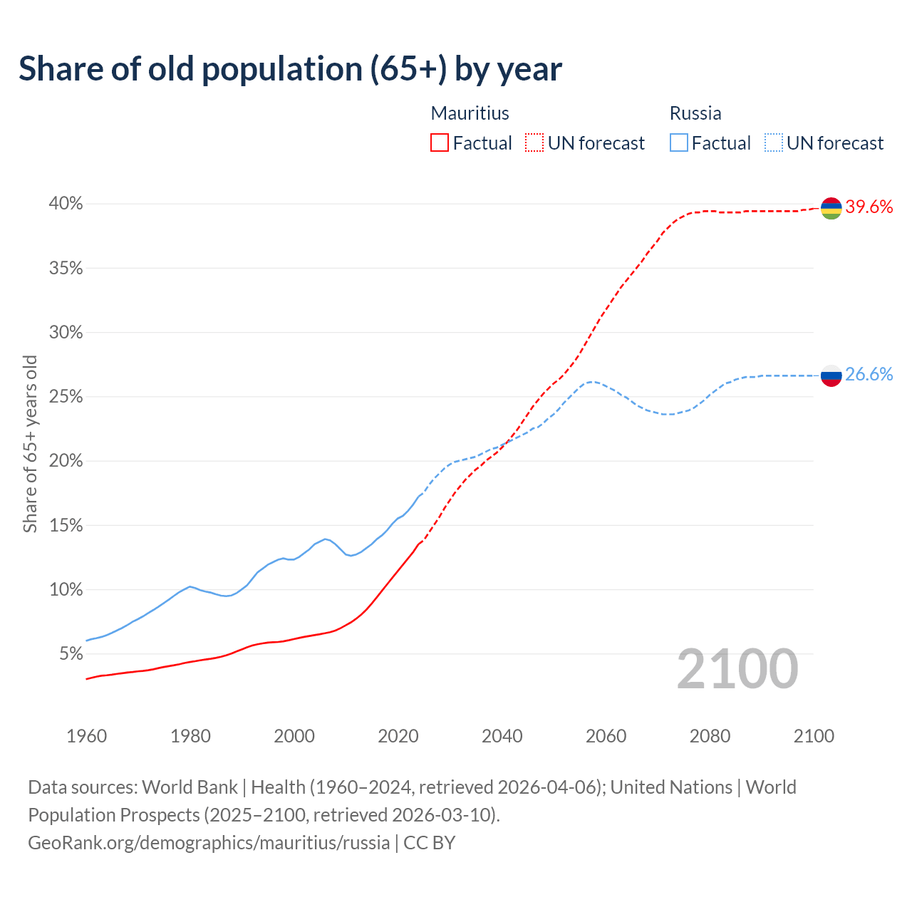 The share of older people aged 65 and over is 13.5% in Mauritius and 17.2% in Russia. Life expectancy in Mauritius compared to Russia .