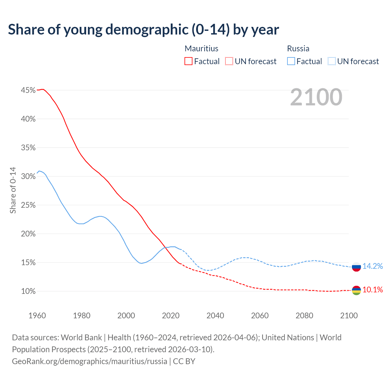 - The share of young demographic (0-15 years old) in Mauritius is 14.8% vs 17.3% in Russia.
