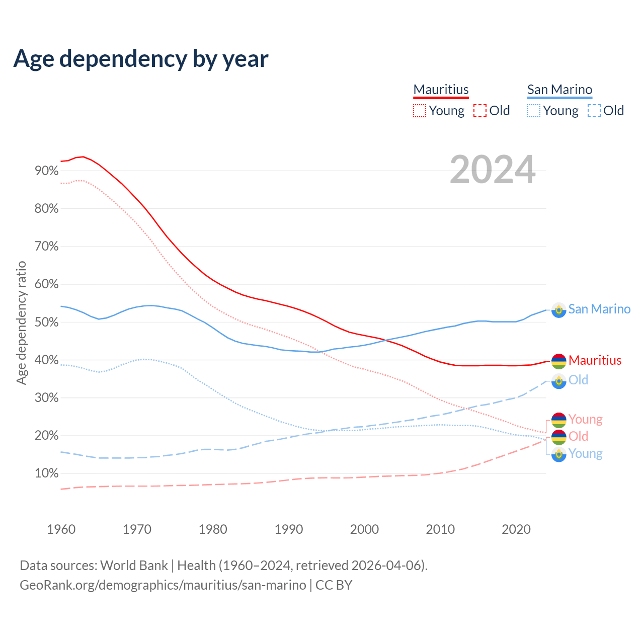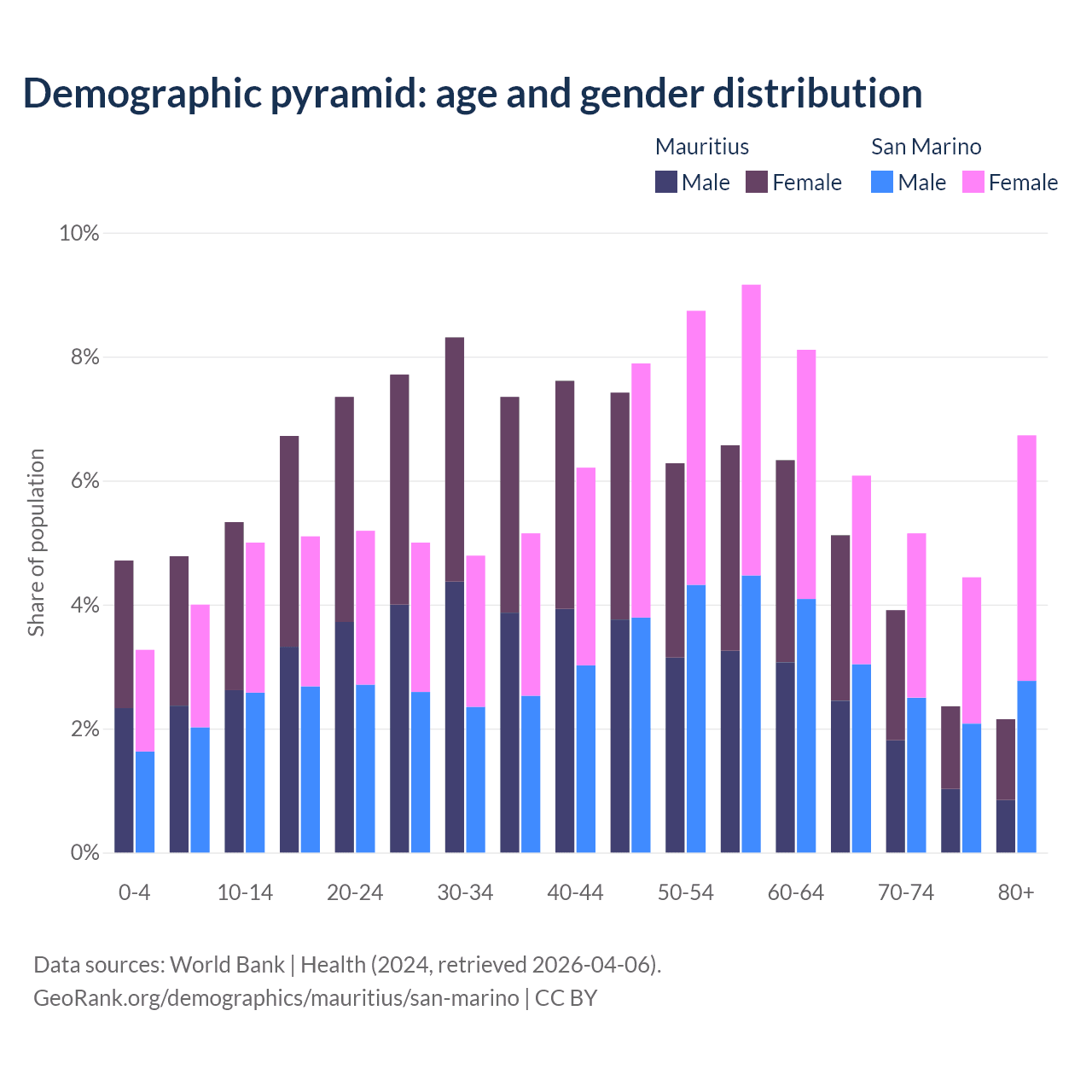 - Mauritius is ranked 57/196 by median age (oldest to youngest) vs 3/196 for San Marino.
