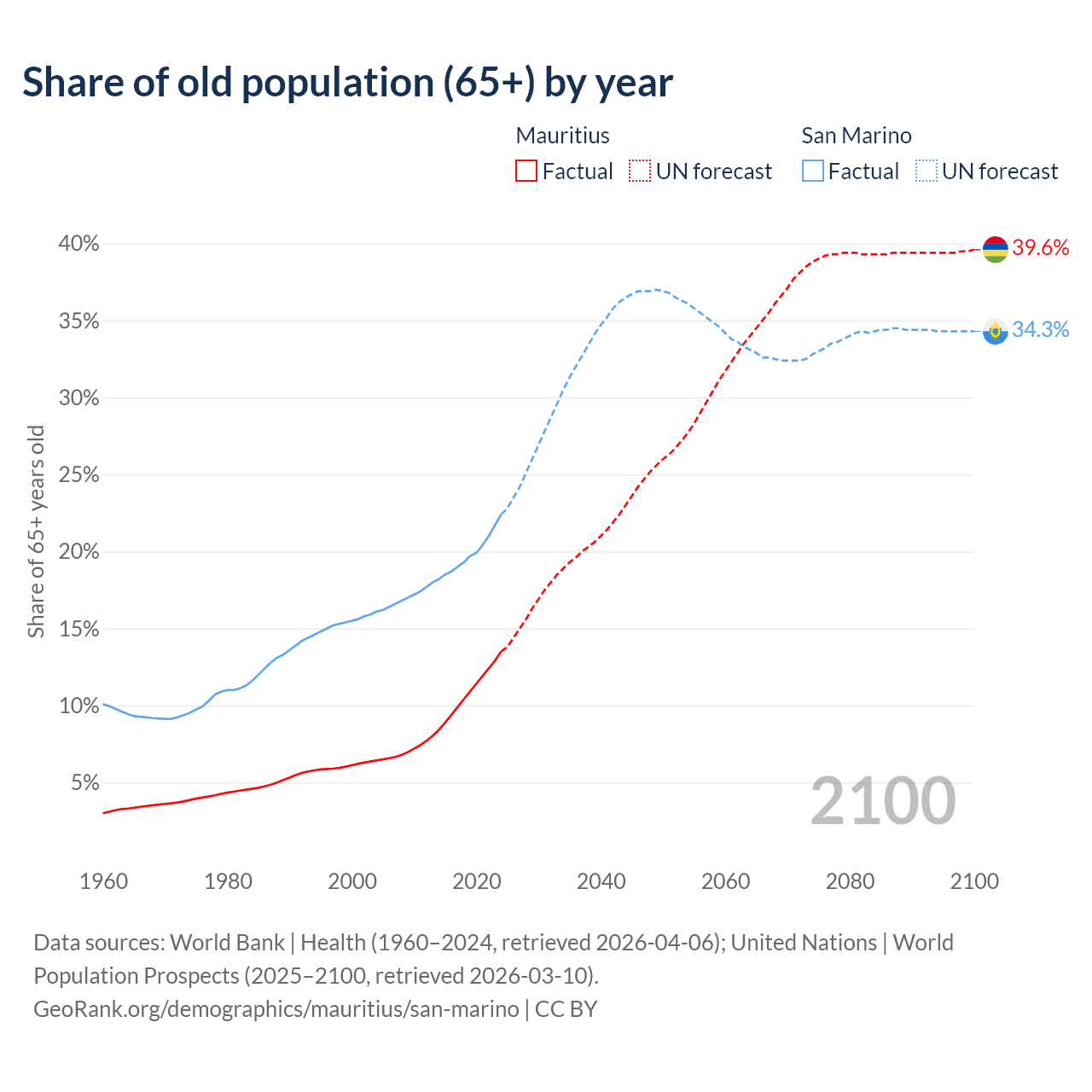 The share of older people aged 65 and over is 13.5% in Mauritius and 22.4% in San Marino. Life expectancy in Mauritius compared to San Marino .