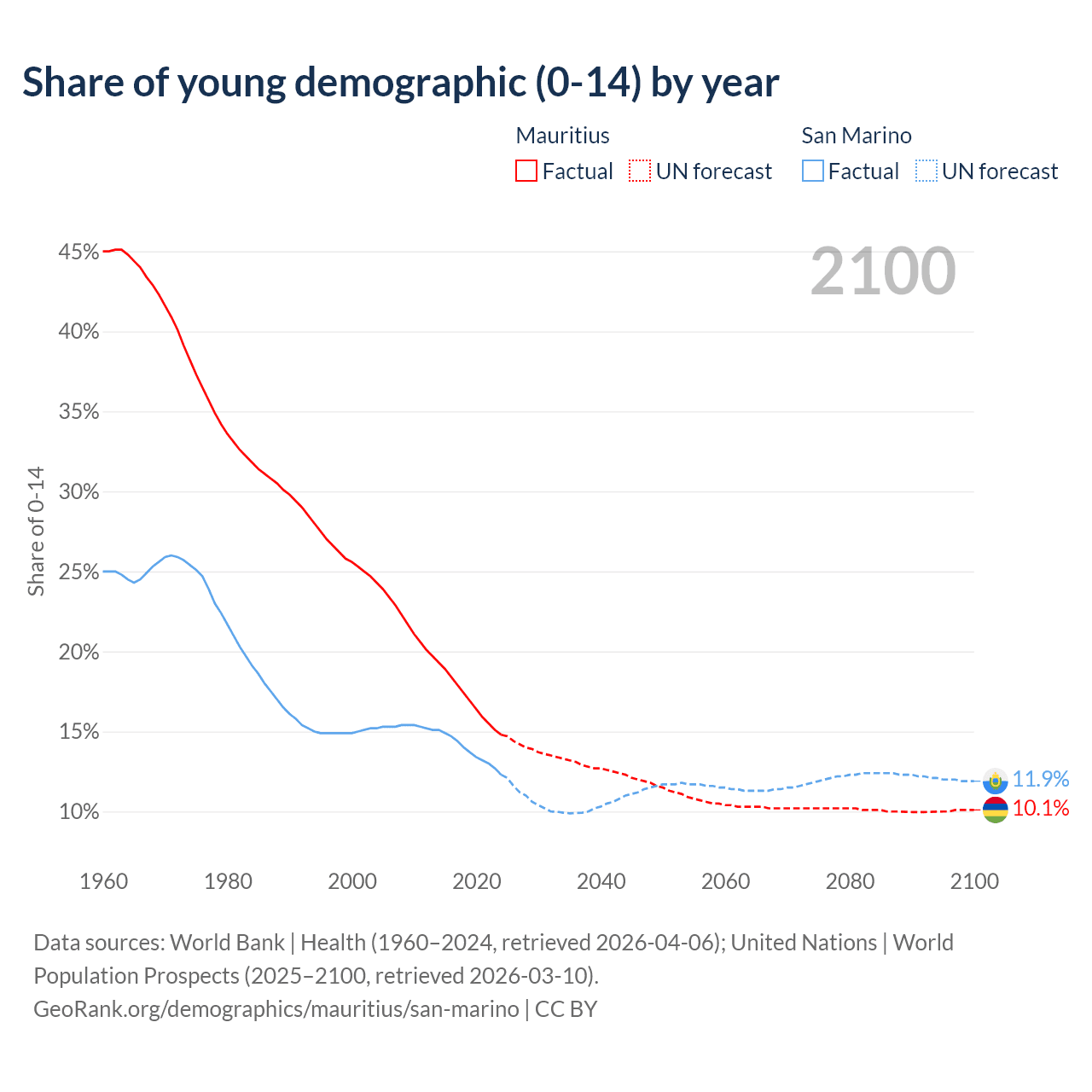 - The share of young demographic (0-15 years old) in Mauritius is 14.8% vs 12.3% in San Marino.