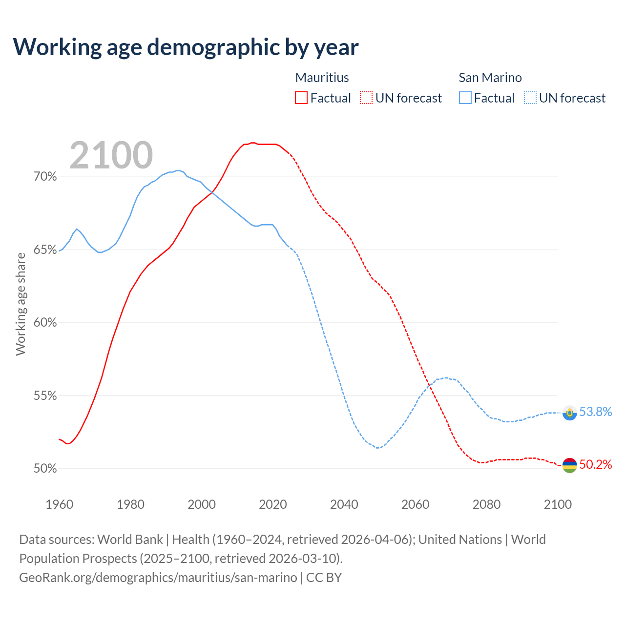 - Mauritius has 889K working age adults (aged 15-64) vs 22.2K in San Marino.