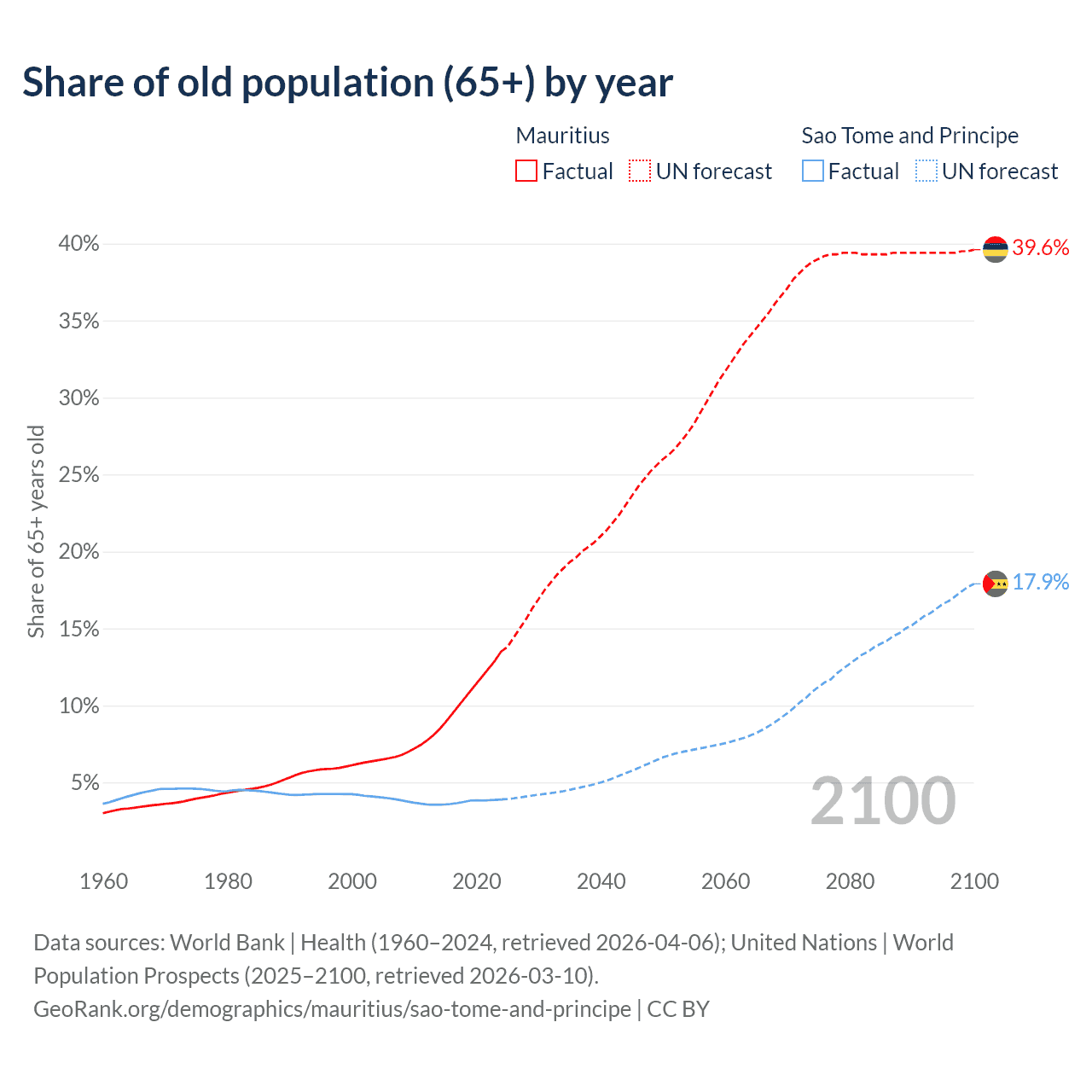 The share of older people aged 65 and over is 13.5% in Mauritius and 3.9% in Sao Tome and Principe. Life expectancy in Mauritius compared to Sao Tome and Principe .