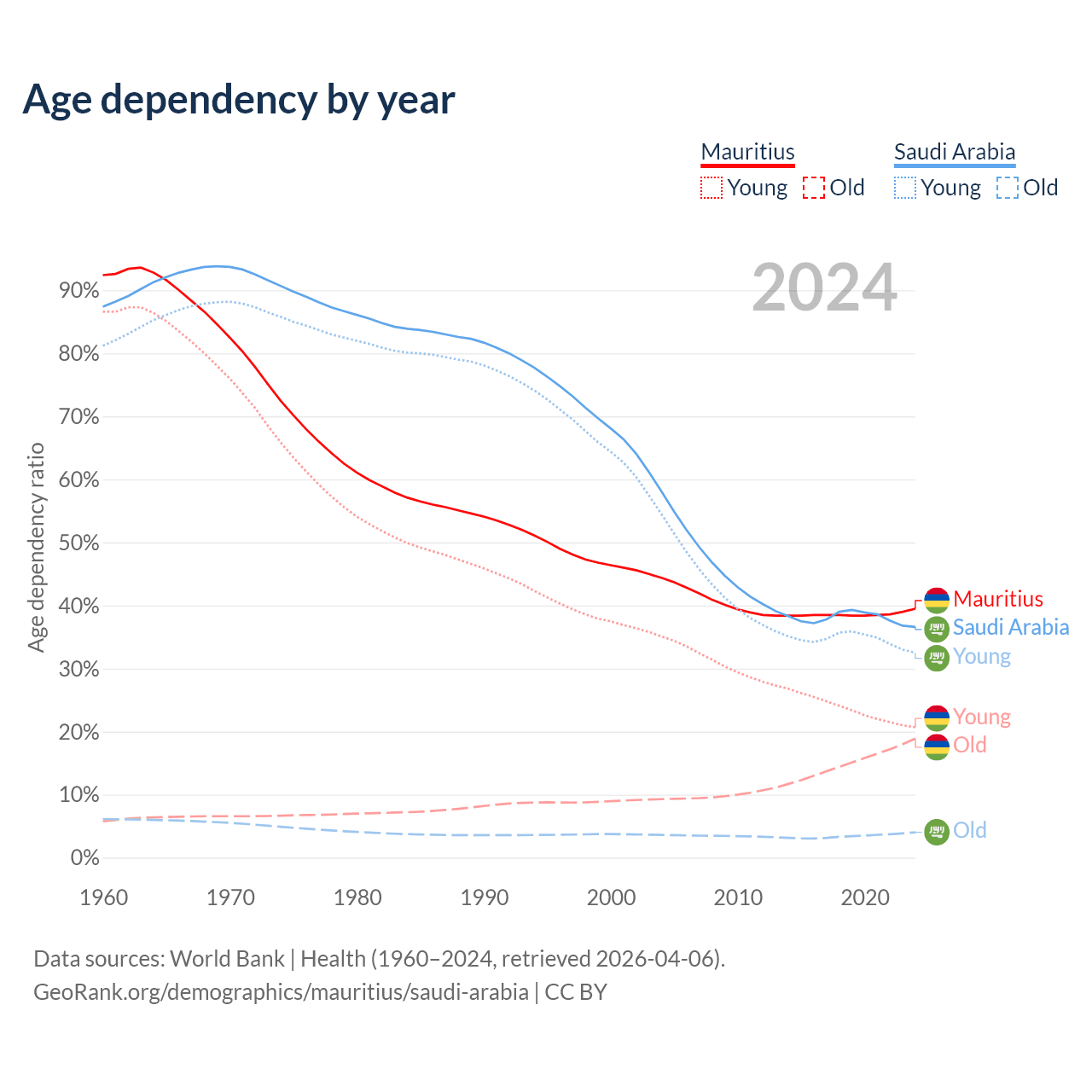 - Mauritius is ranked 57/196 by median age (oldest to youngest) vs 98/196 for Saudi Arabia.