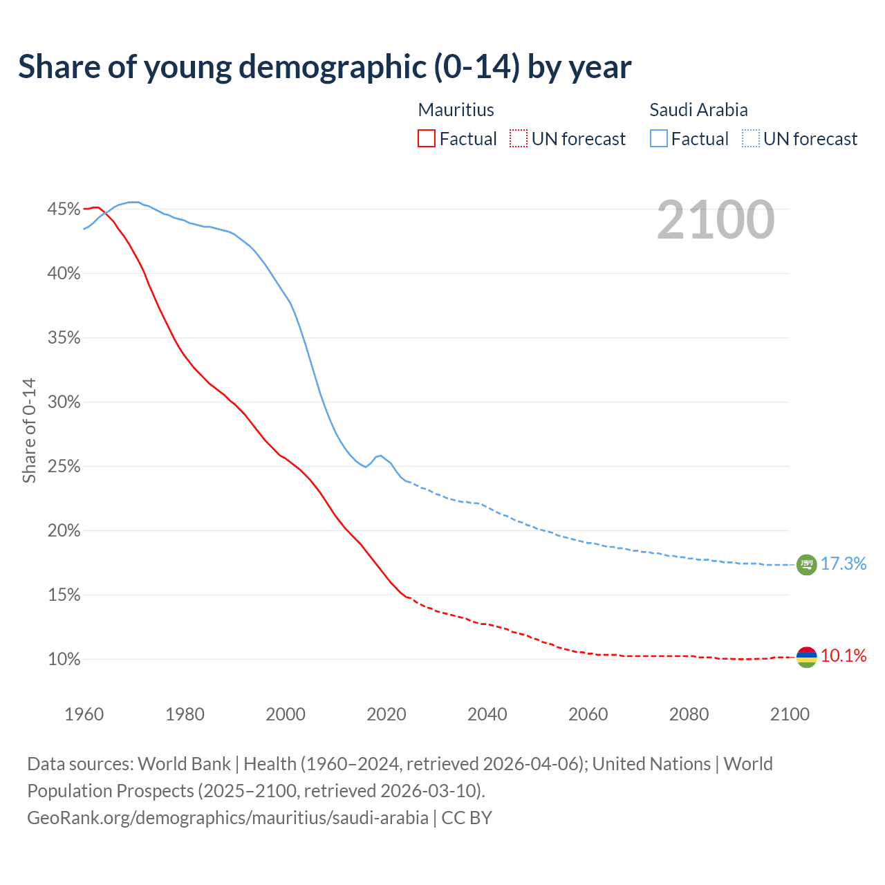 - The share of young demographic (0-15 years old) in Mauritius is 14.8% vs 23.8% in Saudi Arabia.