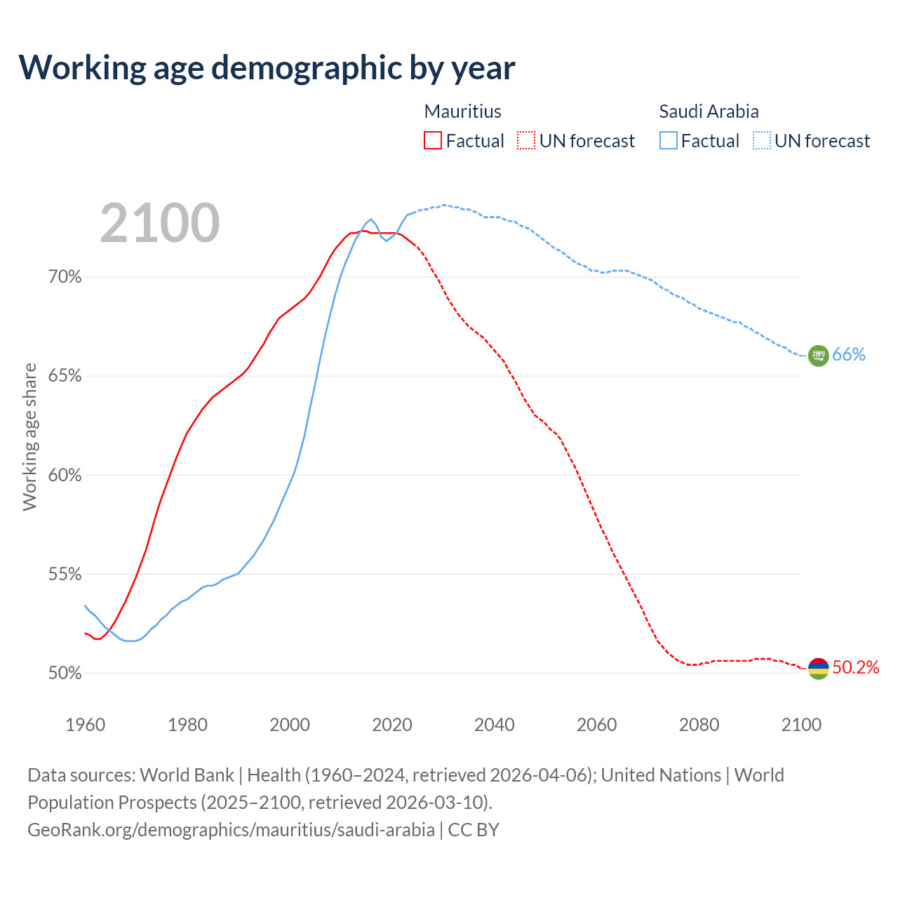 The share of older people aged 65 and over is 13.5% in Mauritius and 2.95% in Saudi Arabia. Life expectancy in Mauritius compared to Saudi Arabia .