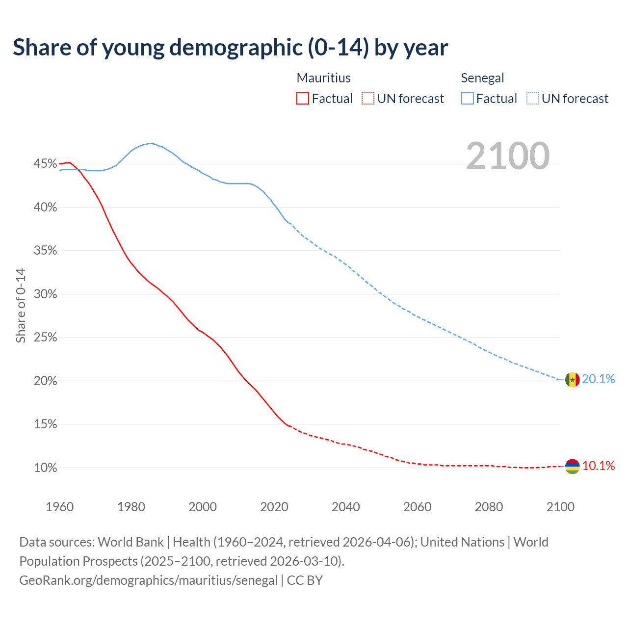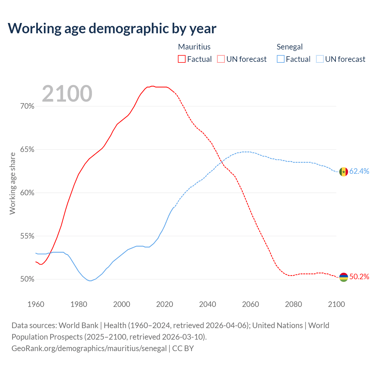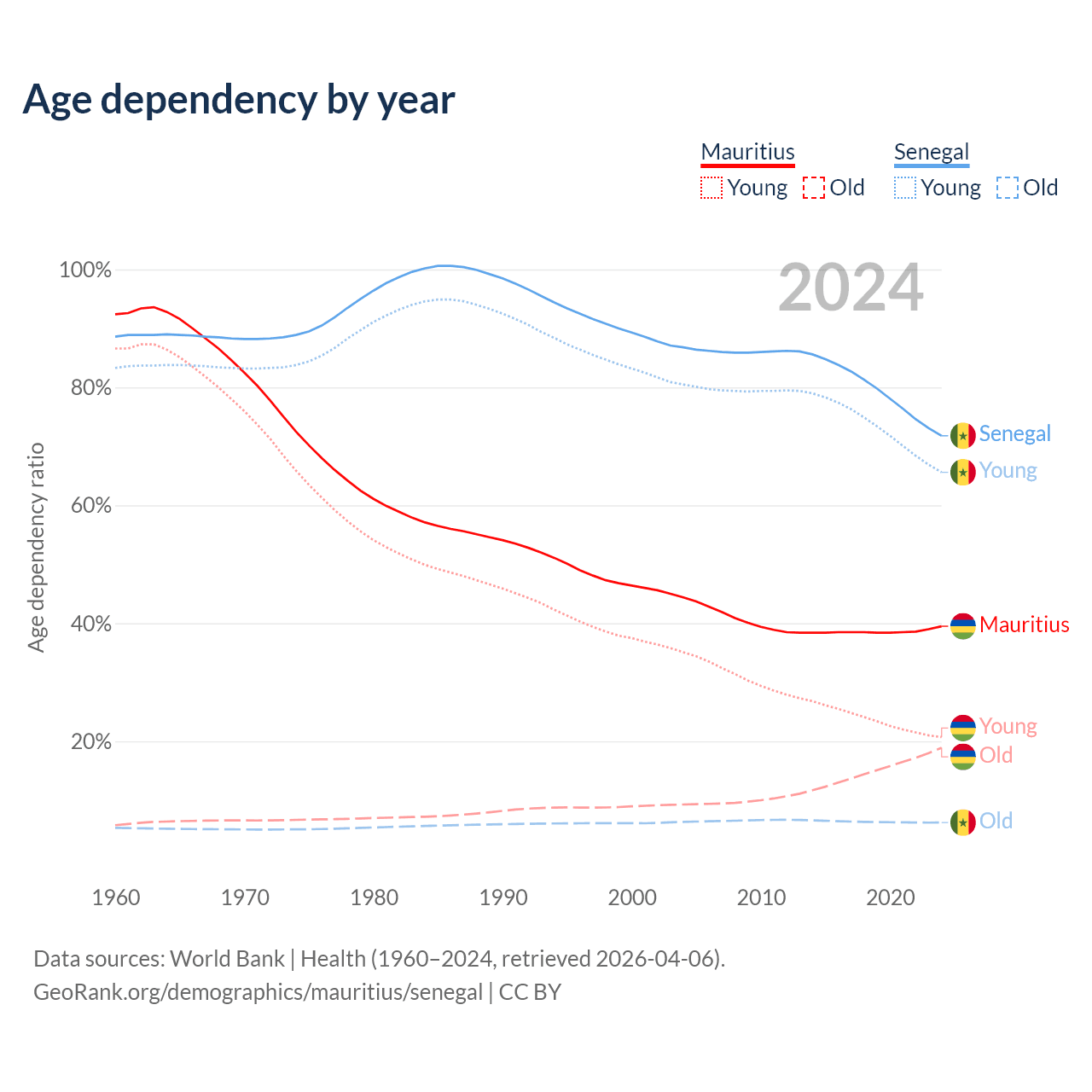 - Mauritius is ranked 57/196 by median age (oldest to youngest) vs 162/196 for Senegal.
