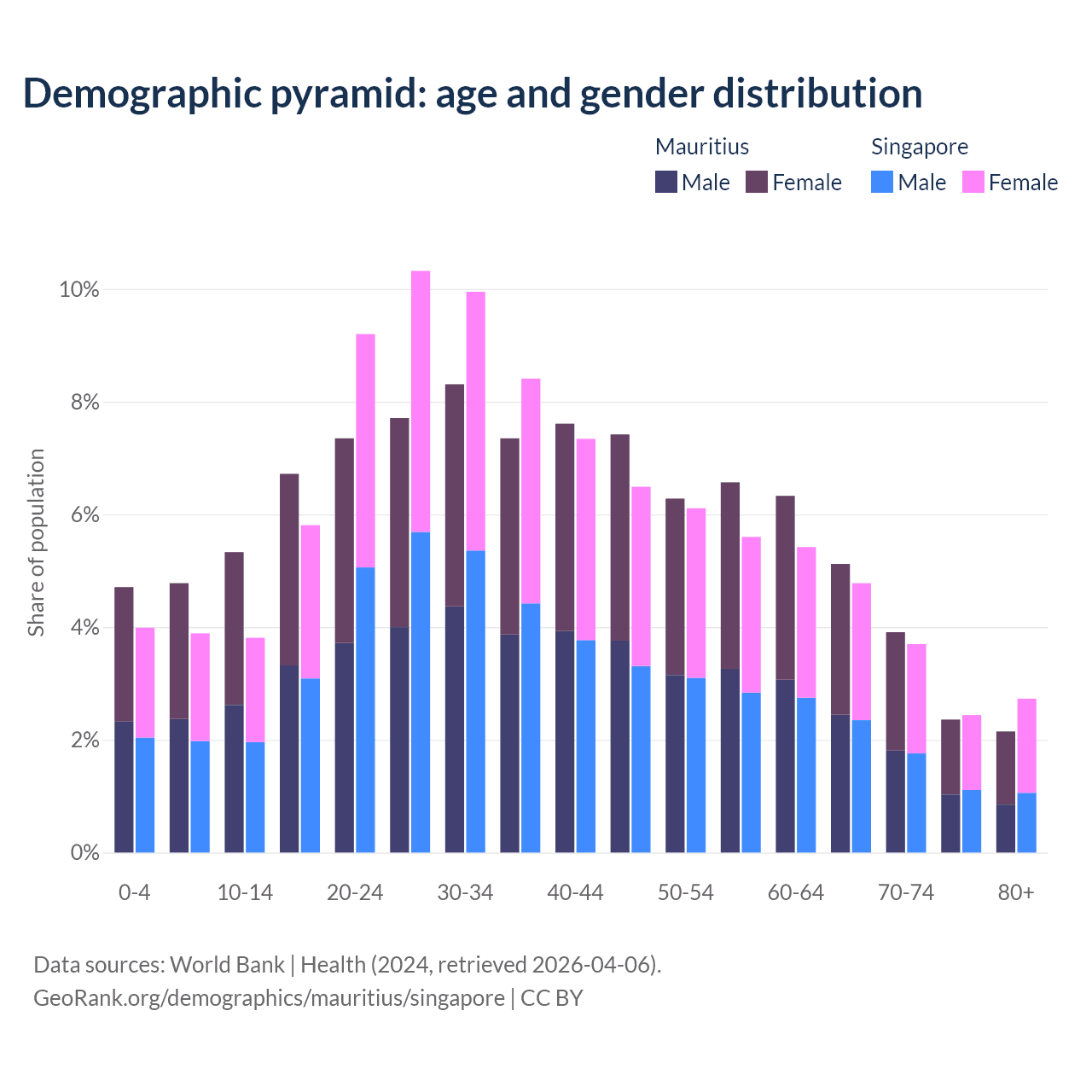 - Mauritius is ranked 57/196 by median age (oldest to youngest) vs 68/196 for Singapore.