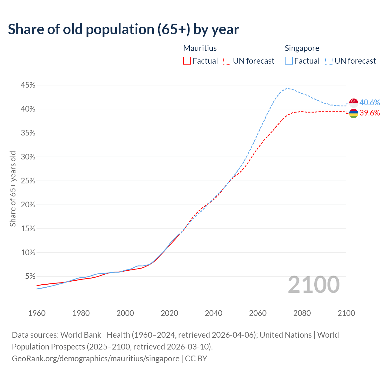 The share of older people aged 65 and over is 13.5% in Mauritius and 13.7% in Singapore. Life expectancy in Mauritius compared to Singapore .