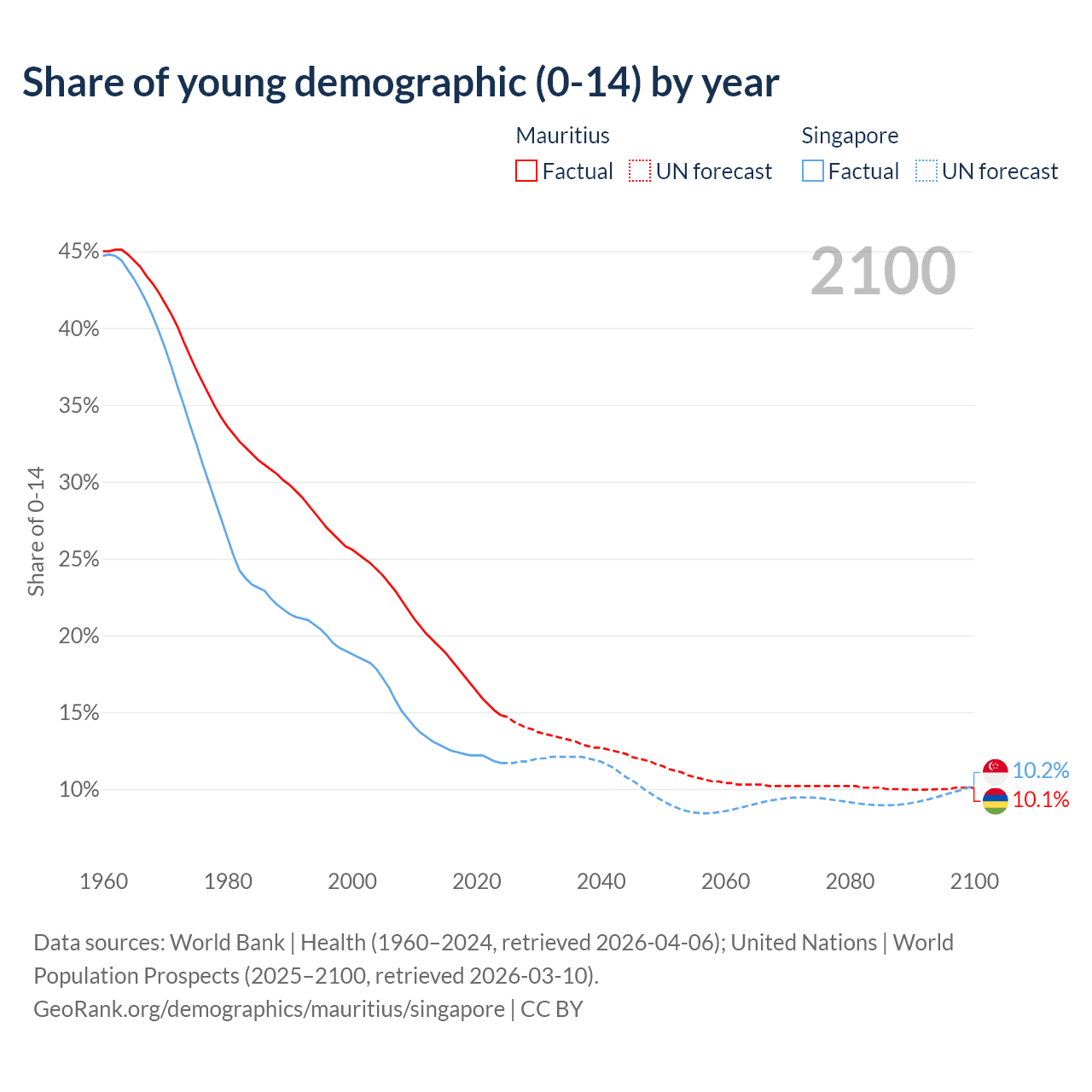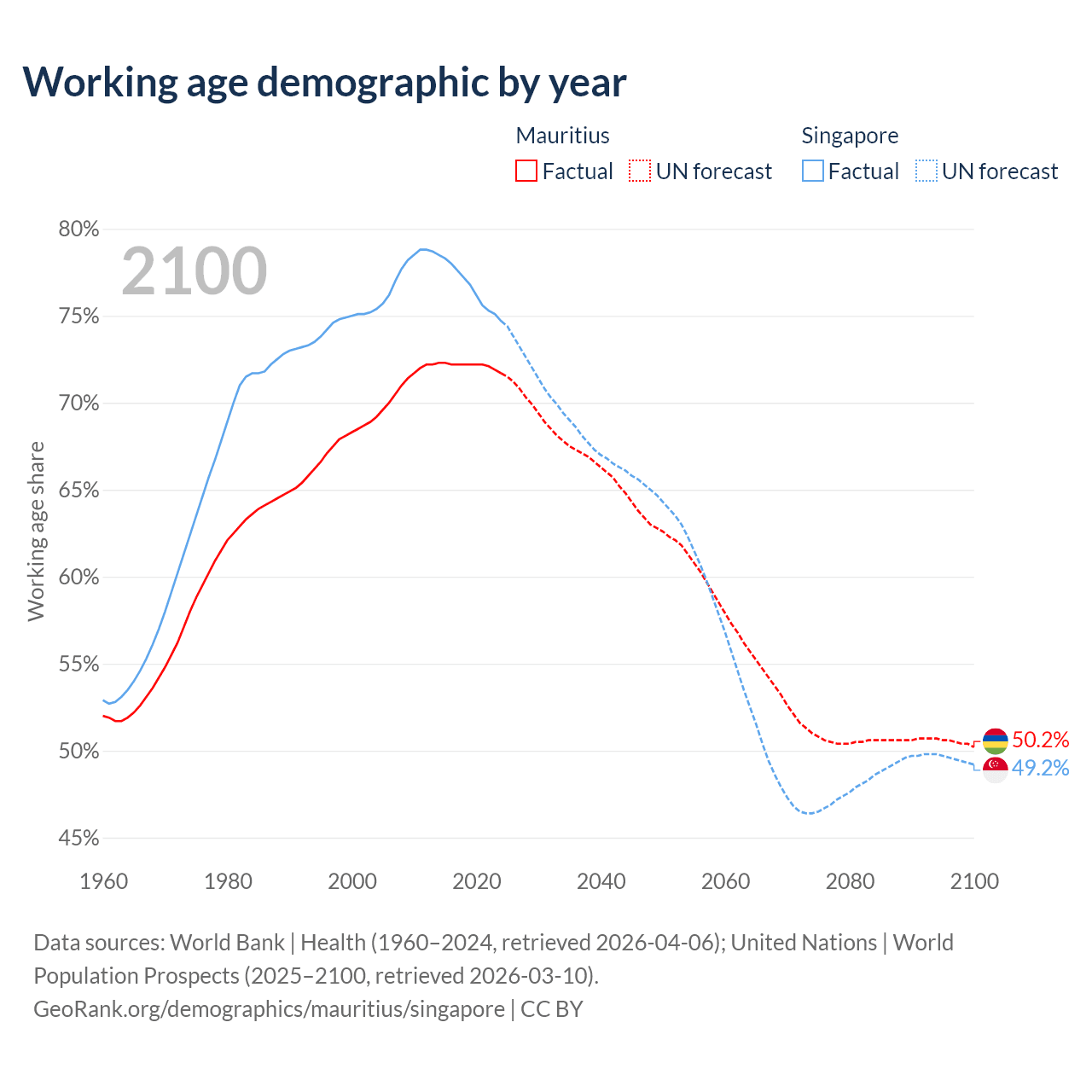 Median age Mauritius vs Singapore, 1960-2100