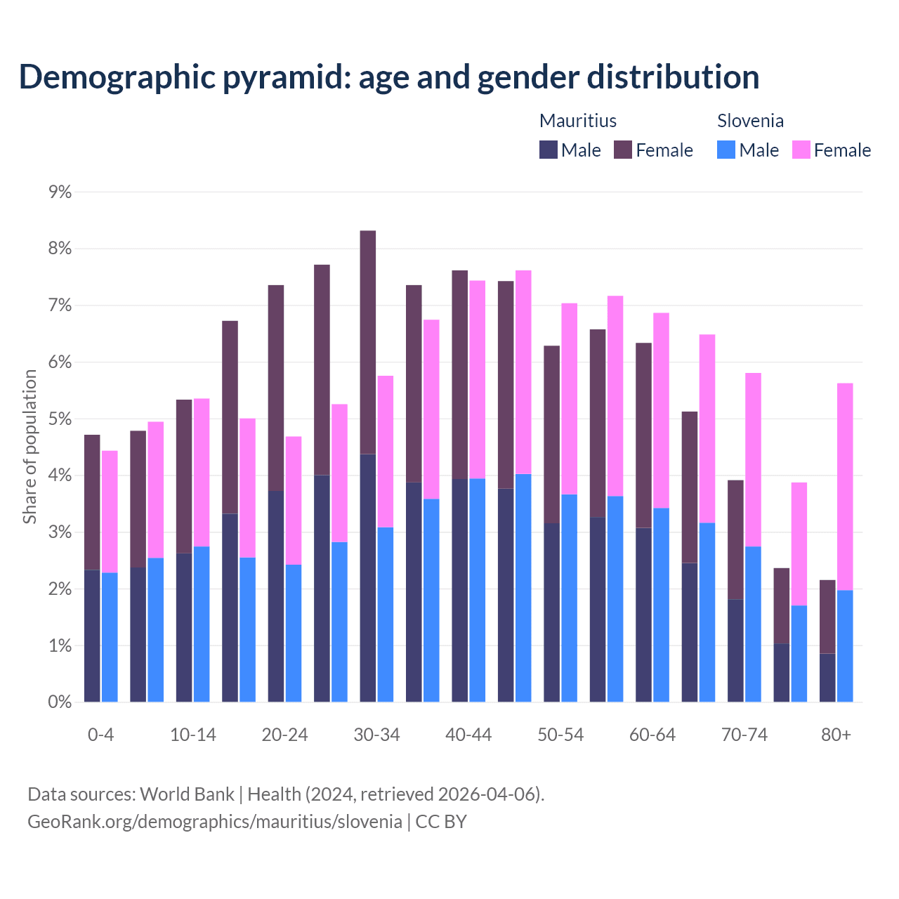 The share of older people aged 65 and over is 13.5% in Mauritius and 21.8% in Slovenia. Life expectancy in Mauritius compared to Slovenia .