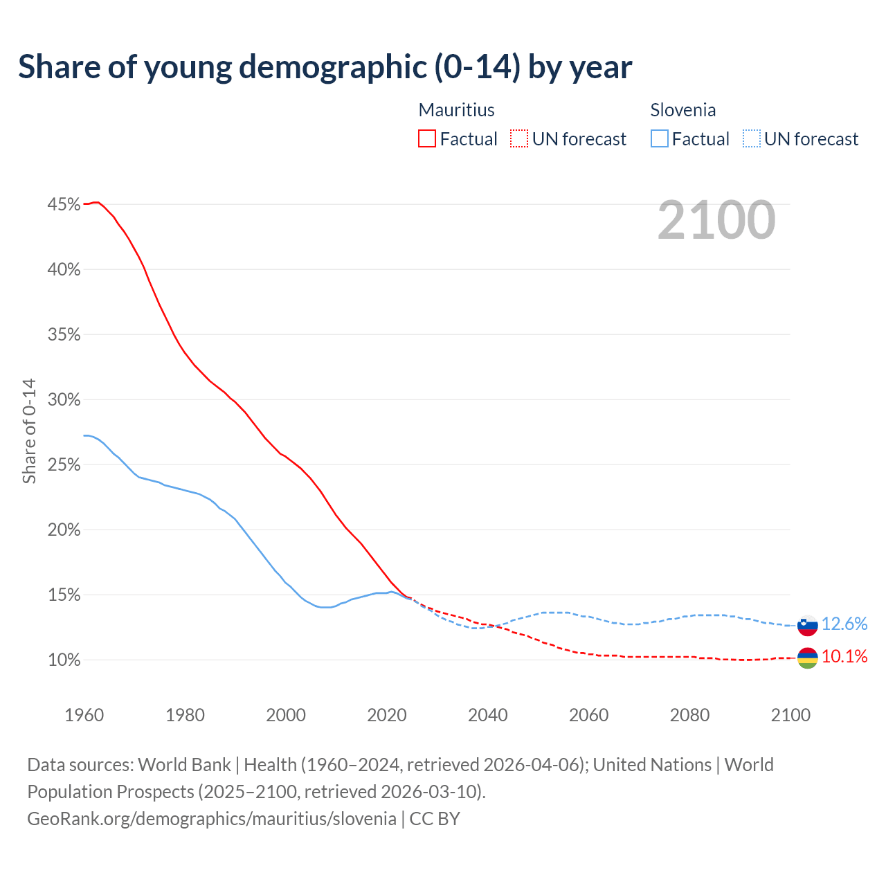 - The share of young demographic (0-15 years old) in Mauritius is 14.8% vs 14.7% in Slovenia.