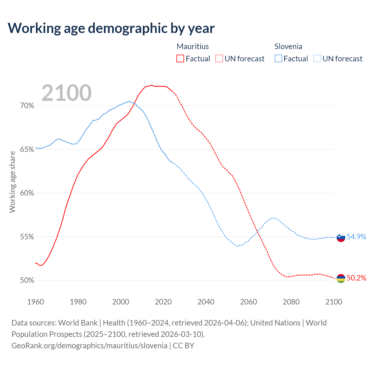 Median age Mauritius vs Slovenia, 1960-2100