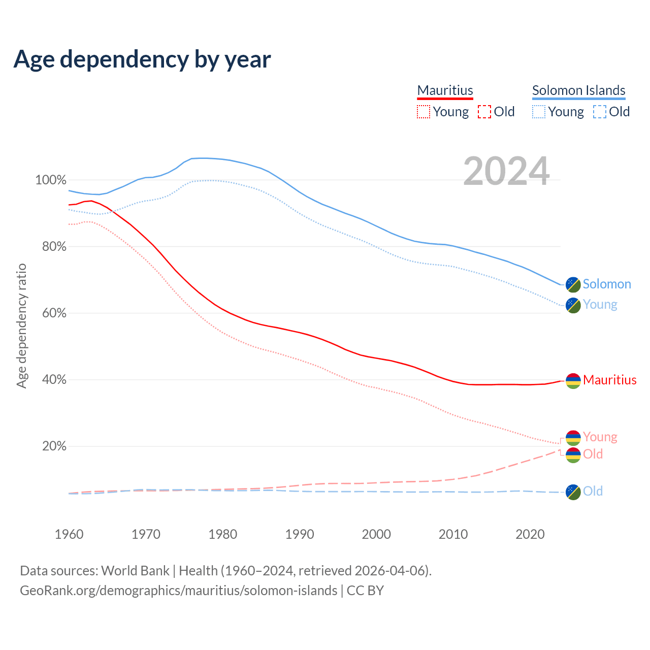 - Mauritius is ranked 57/196 by median age (oldest to youngest) vs 153/196 for the Solomon Islands.