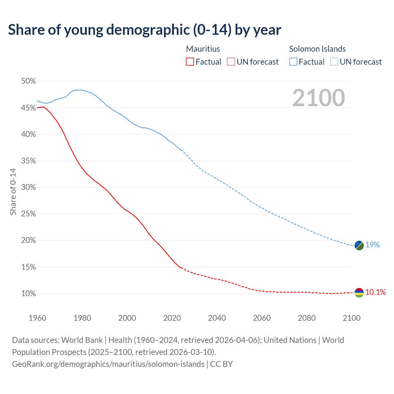 - The share of young demographic (0-15 years old) in Mauritius is 14.8% vs 37% in the Solomon Islands.