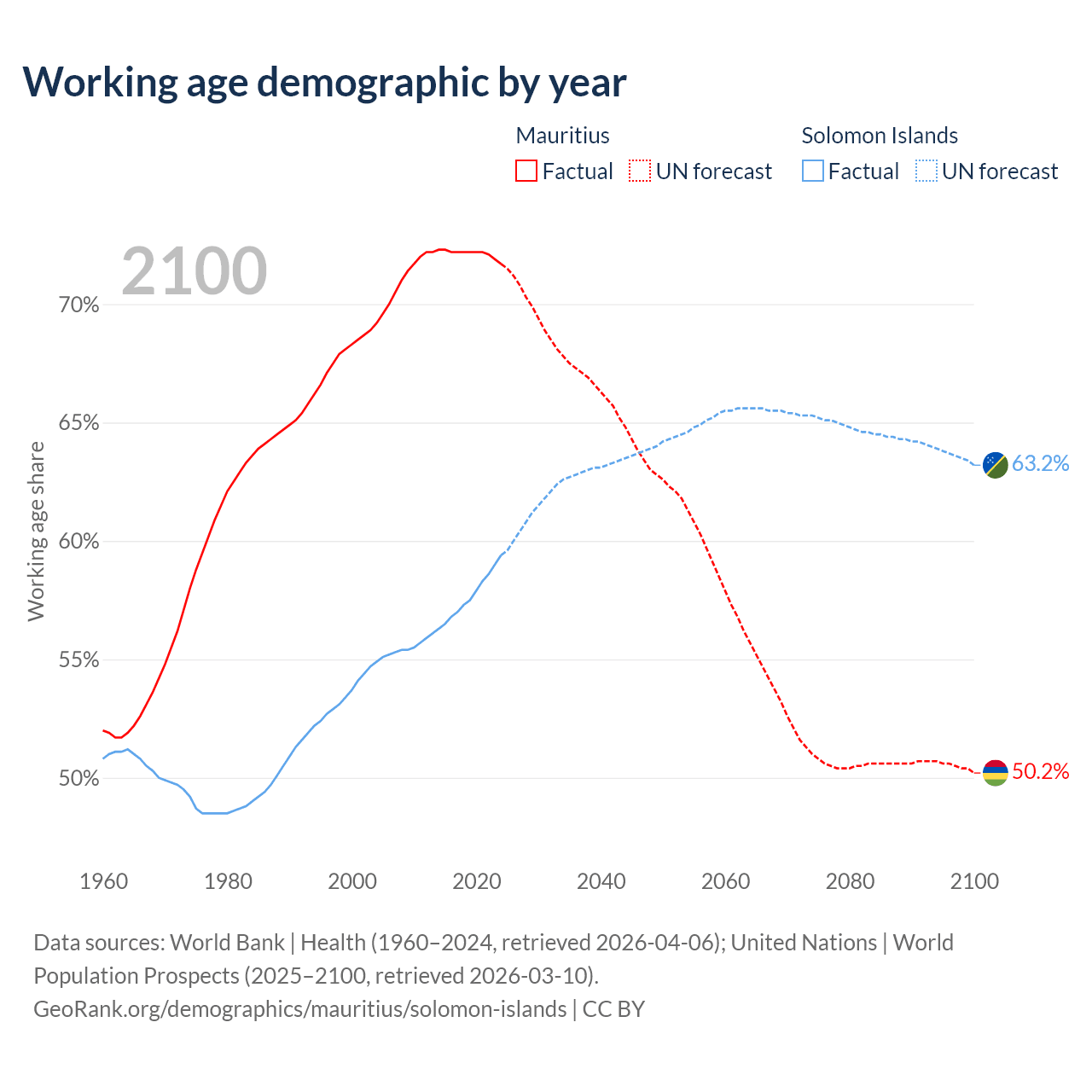- Mauritius has 889K working age adults (aged 15-64) vs 513K in the Solomon Islands.