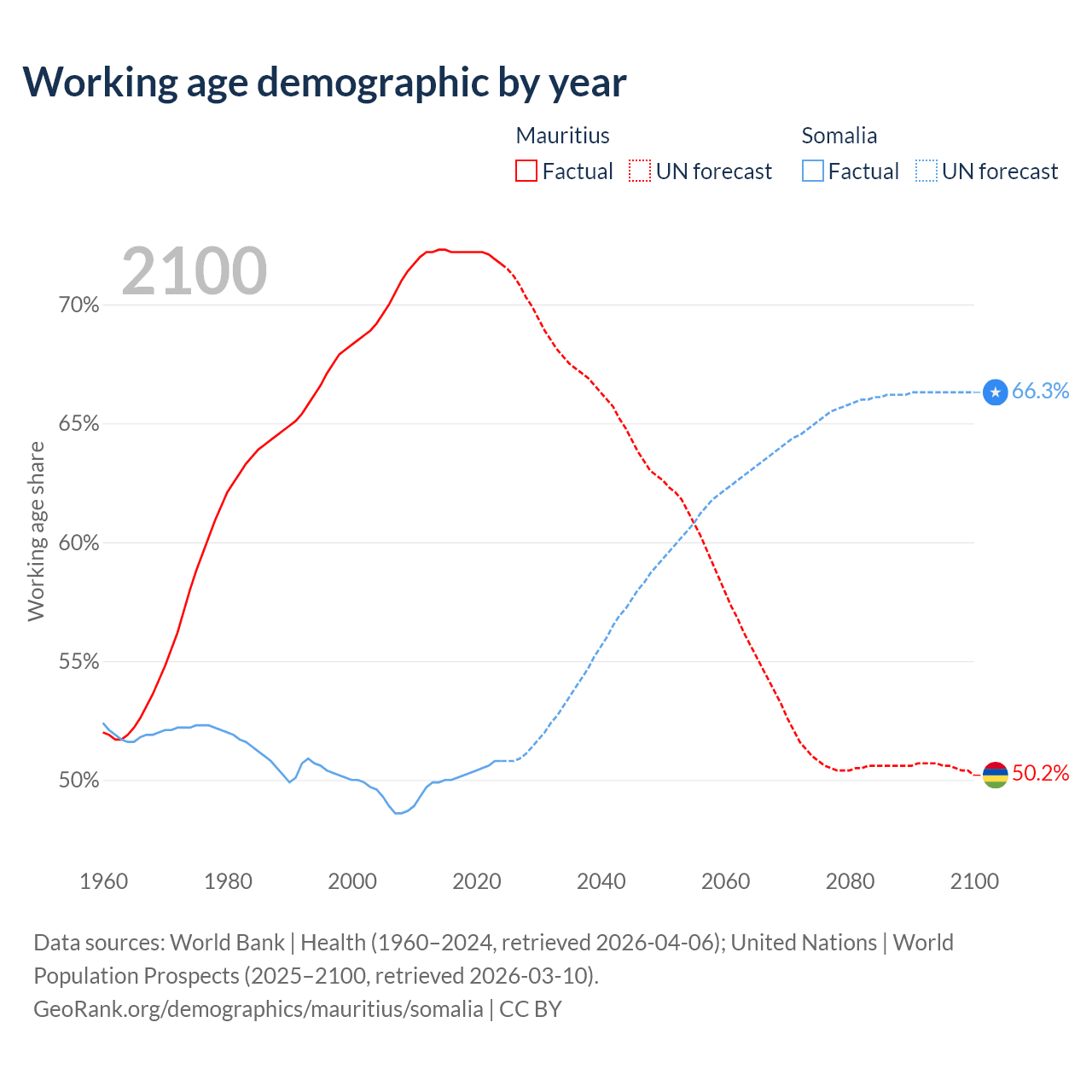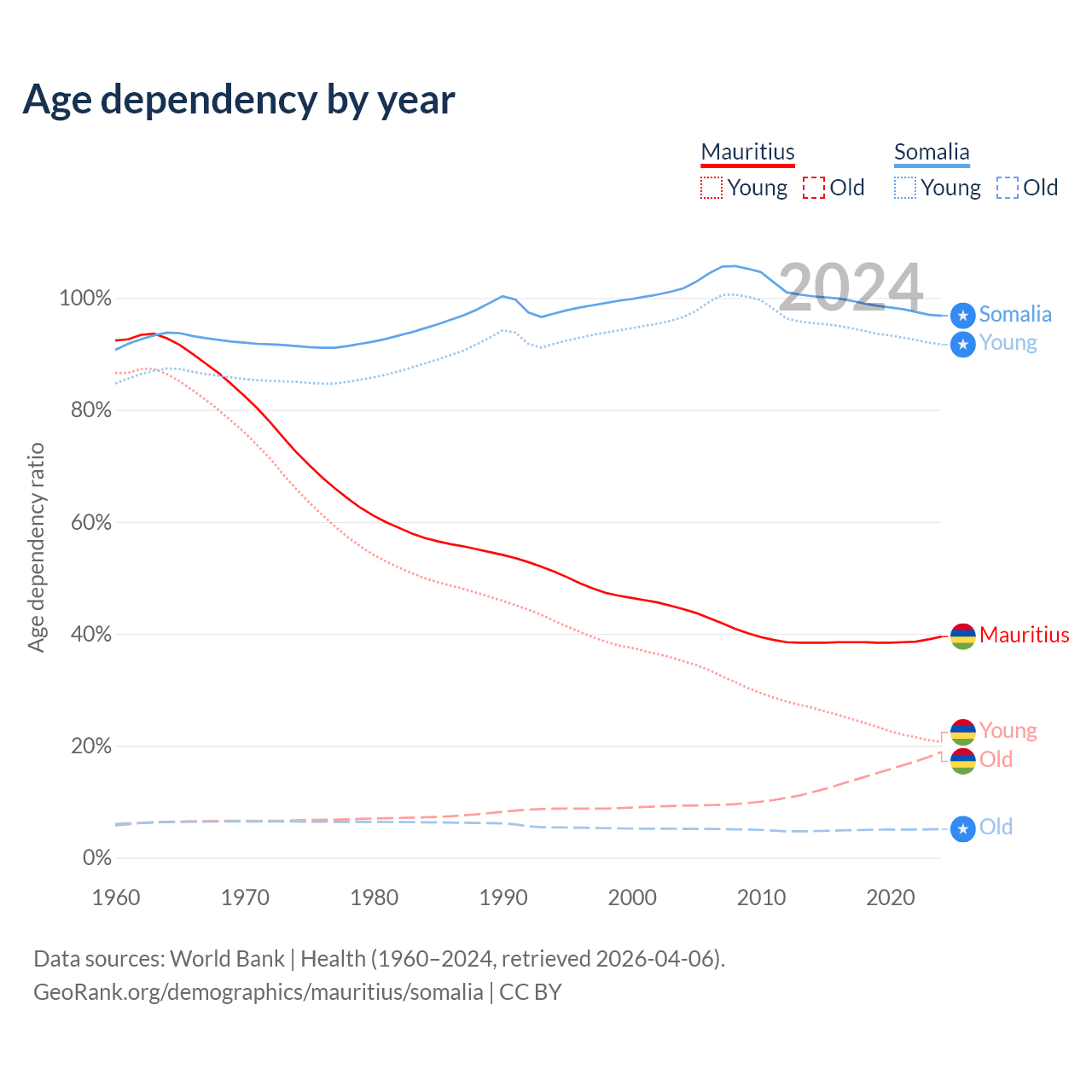 - Mauritius is ranked 57/196 by median age (oldest to youngest) vs 194/196 for Somalia.