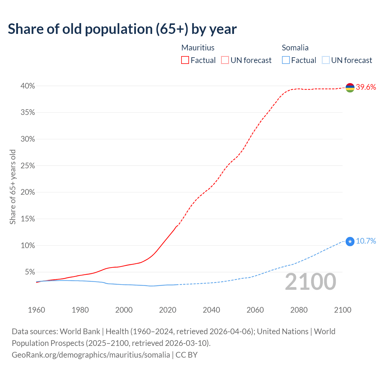 The share of older people aged 65 and over is 13.5% in Mauritius and 2.59% in Somalia. Life expectancy in Mauritius compared to Somalia .