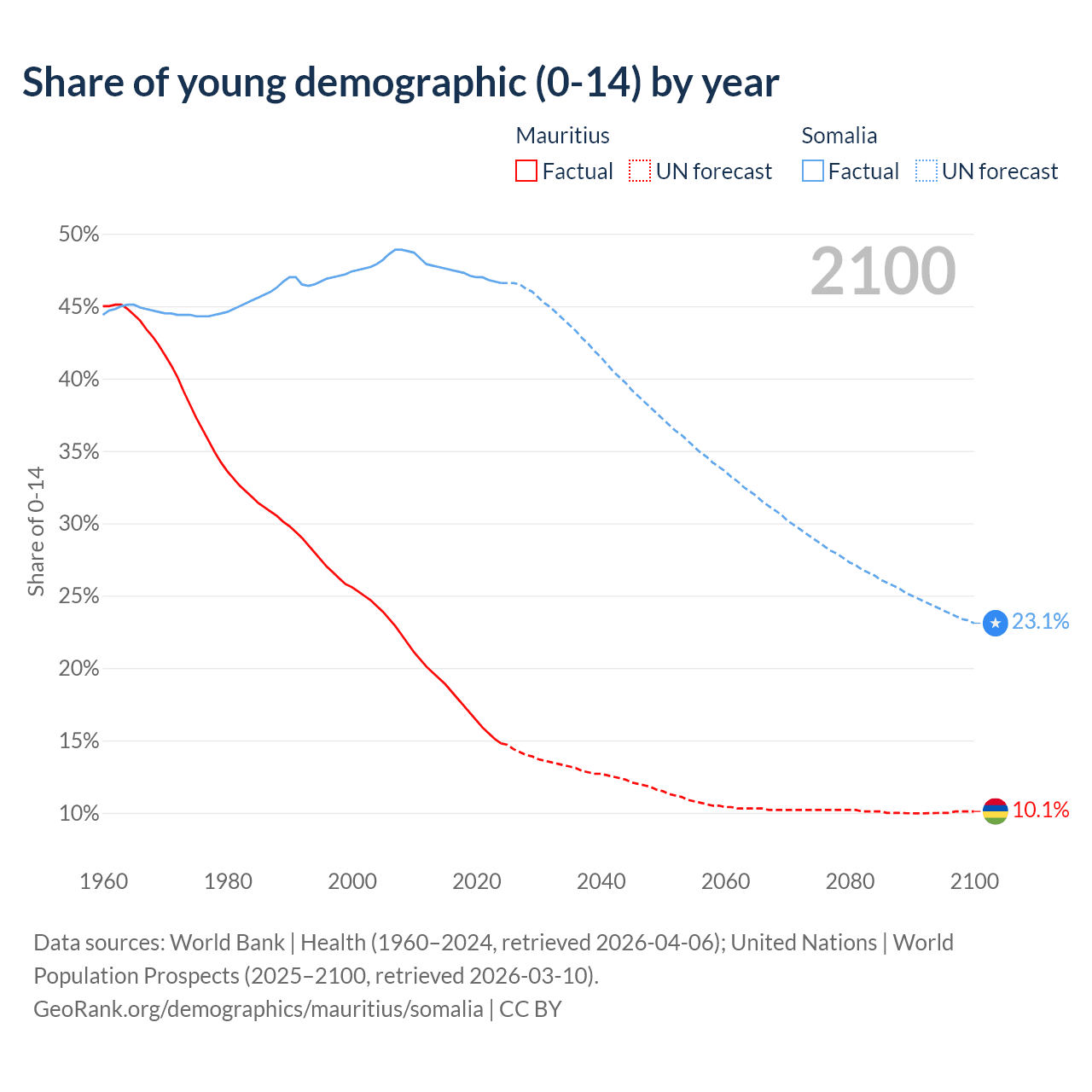 - The share of young demographic (0-15 years old) in Mauritius is 14.8% vs 46.6% in Somalia.