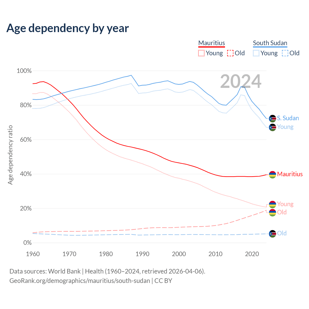 - Mauritius is ranked 57/196 by median age (oldest to youngest) vs 173/196 for South Sudan.