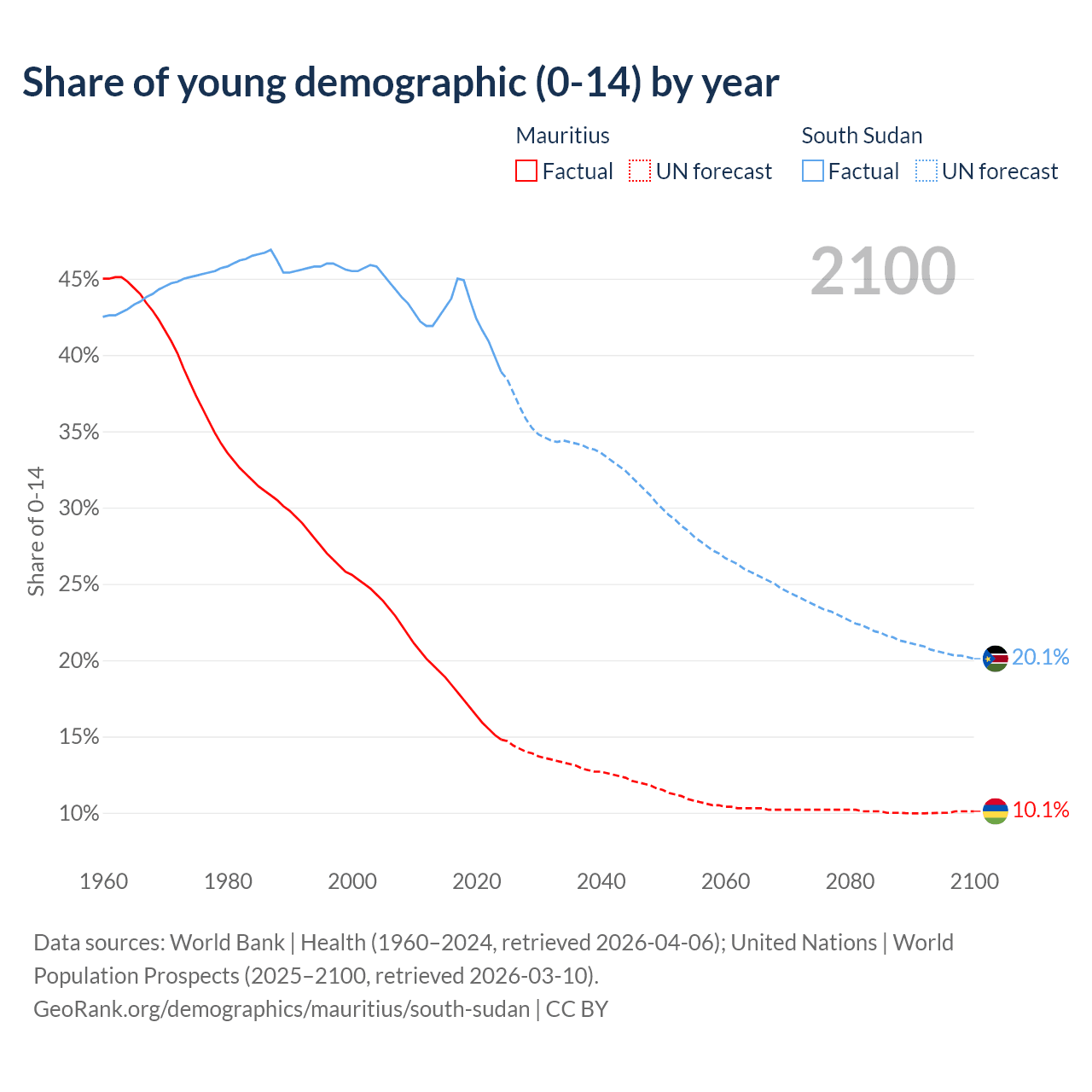 - The share of young demographic (0-15 years old) in Mauritius is 14.8% vs 38.9% in South Sudan.