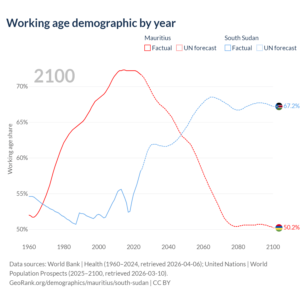 - Mauritius has 889K working age adults (aged 15-64) vs 7.27M in South Sudan.