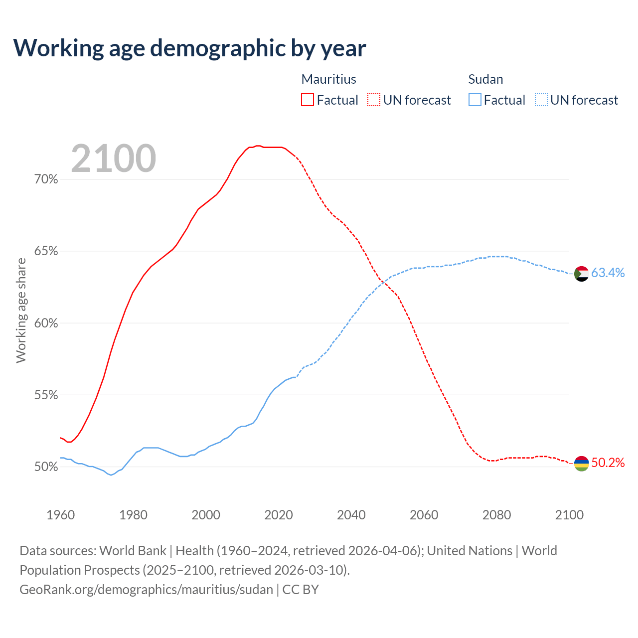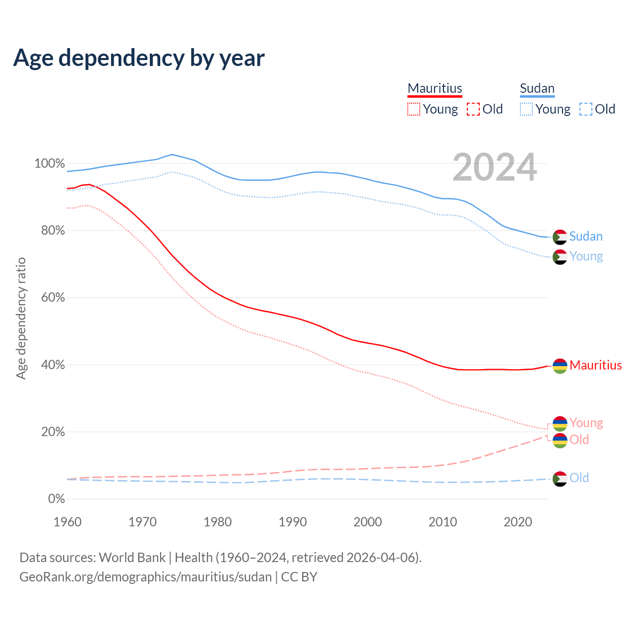 - Mauritius is ranked 57/196 by median age (oldest to youngest) vs 172/196 for Sudan.