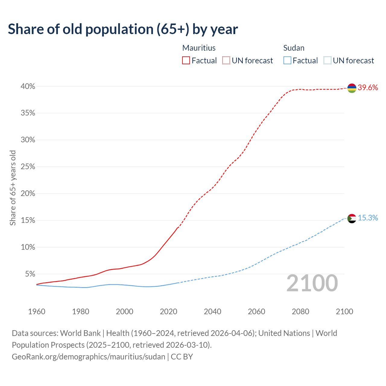 - The share of old-age demographic (65+) in Mauritius is 13.5% vs 3.3% in Sudan.
