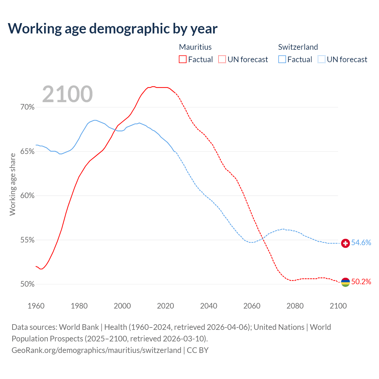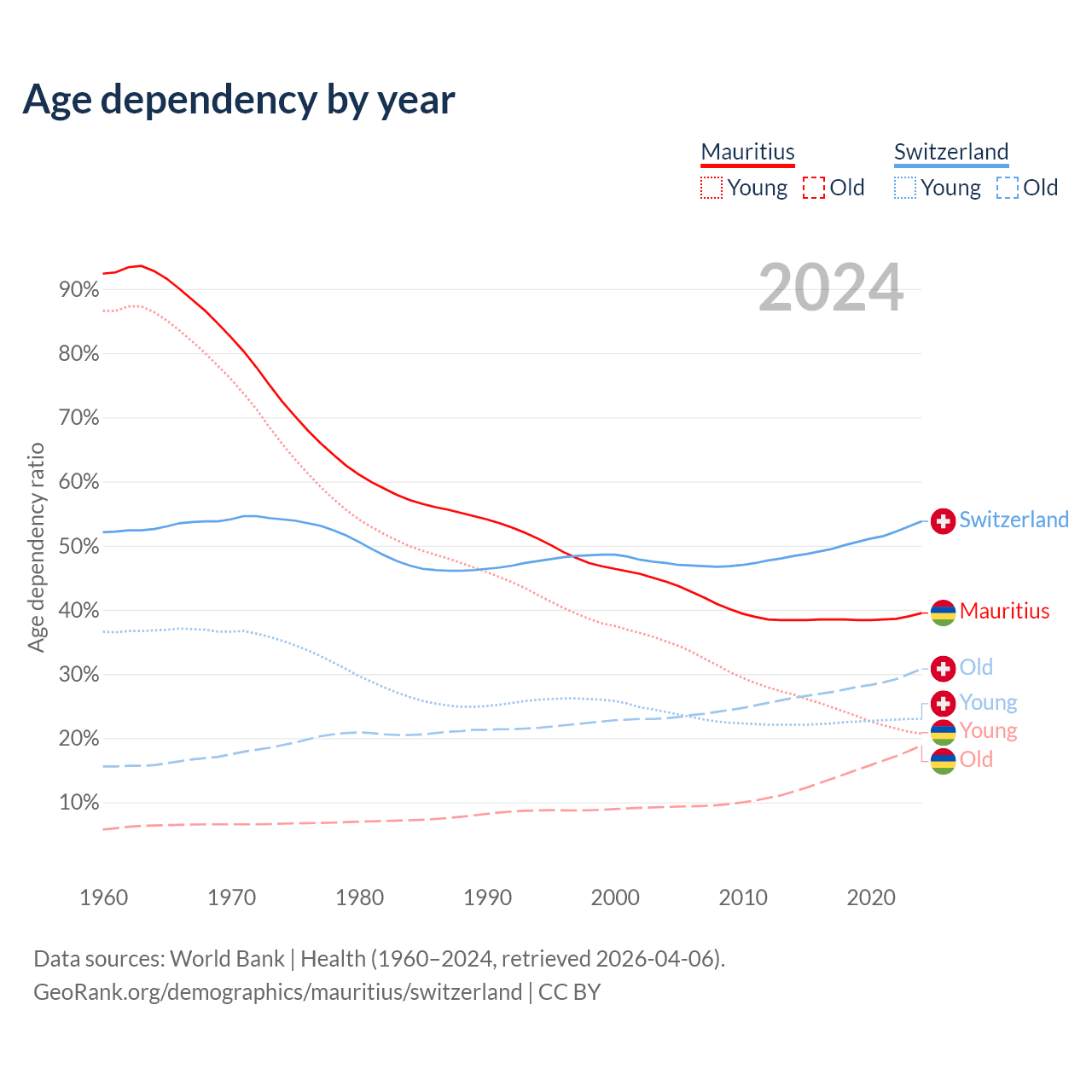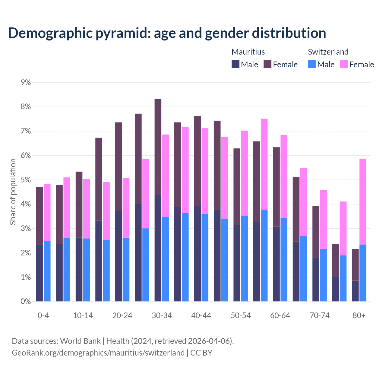 The share of older people aged 65 and over is 13.5% in Mauritius and 20% in Switzerland. Life expectancy in Mauritius compared to Switzerland .