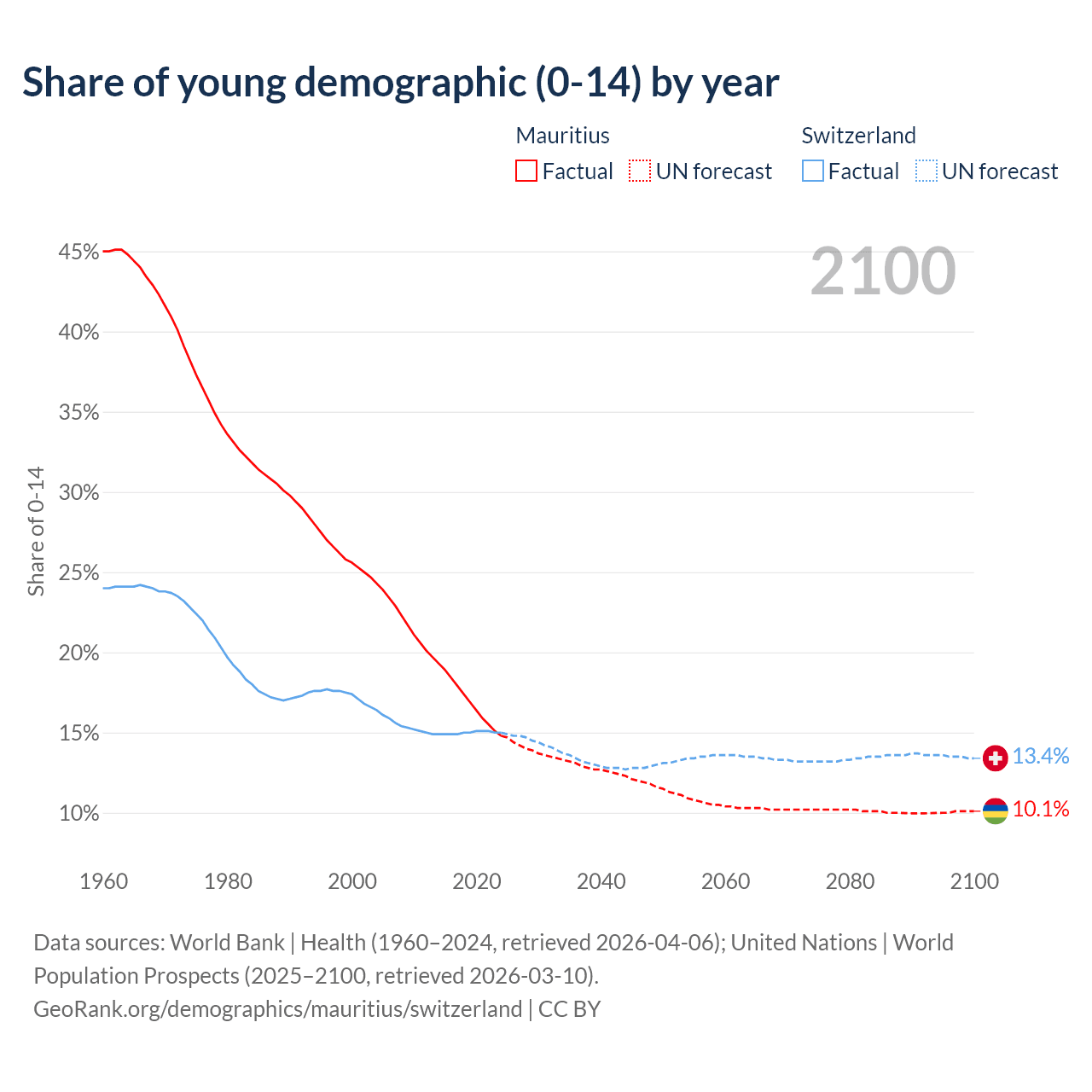 - The share of young demographic (0-15 years old) in Mauritius is 14.8% vs 15% in Switzerland.