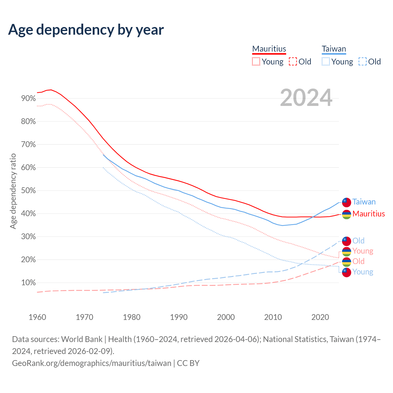 Data sources: World Bank | Health (1960–2024, retrieved 2026-04-06); U.S. Census Bureau (1960–2024, retrieved 2026-02-08); National Statistics, Taiwan (1974–2024, retrieved 2026-02-09).