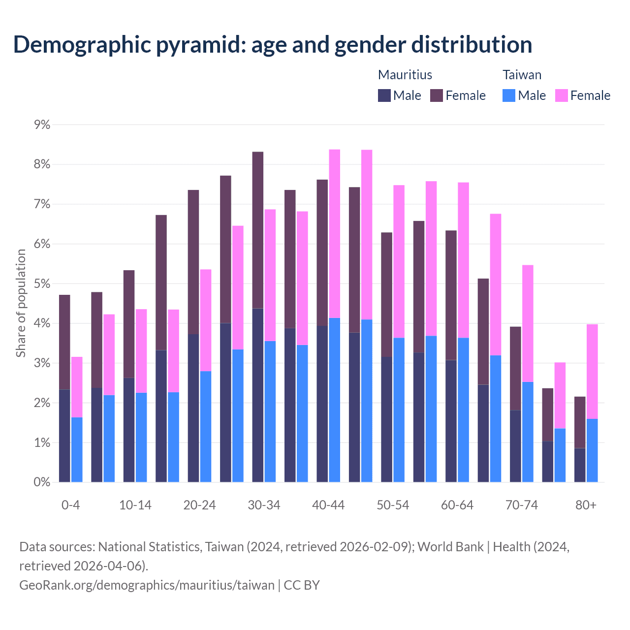 - The median age in Mauritius is 38.5 years compared to 45.1 years in Taiwan.