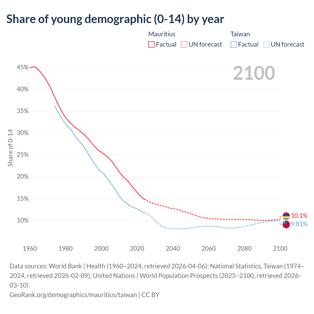 - The share of young demographic (0-15 years old) in Mauritius is 14.8% vs 11.7% in Taiwan.